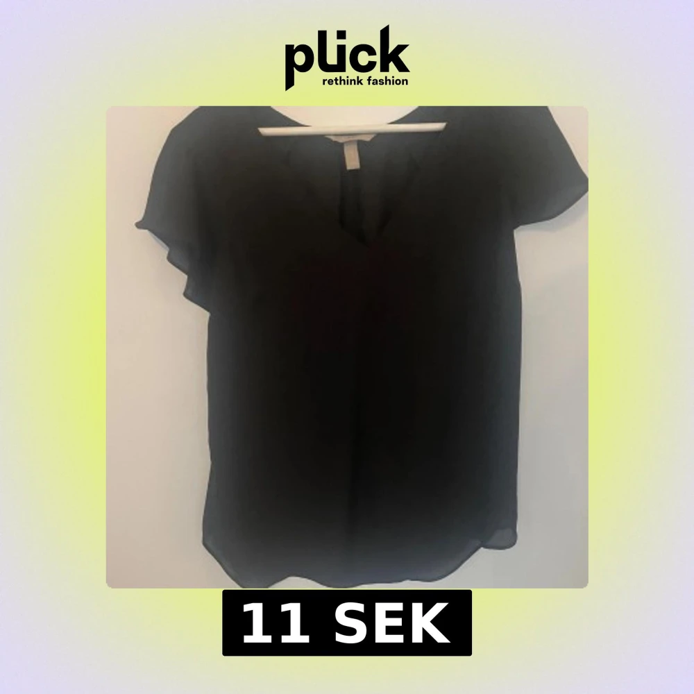 En svart blus från H&M med v-ringning och korta, luftiga ärmar. Tunt och lätt material som ger ett snyggt fall. Perfekt att styla med jeans eller kjol för en clean look.strl 40 men känns som en m. Använd en gång. Går att pruta