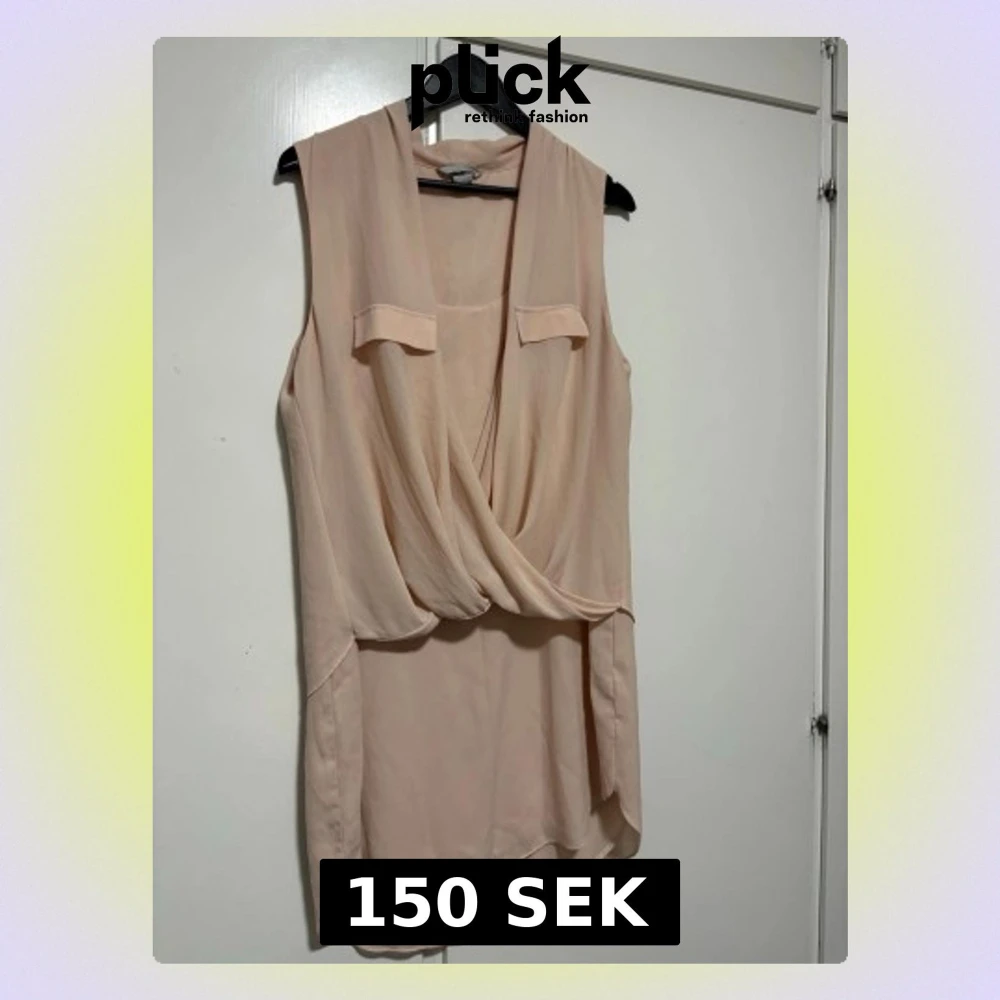 Säljer en snygg beige ärmlös linnetopp med omlottdesign och dekorativa fickdetaljer framtill. Toppen har en avslappnad passform och är tillverkad i ett tunt, mjukt material som passar perfekt till sommaren.