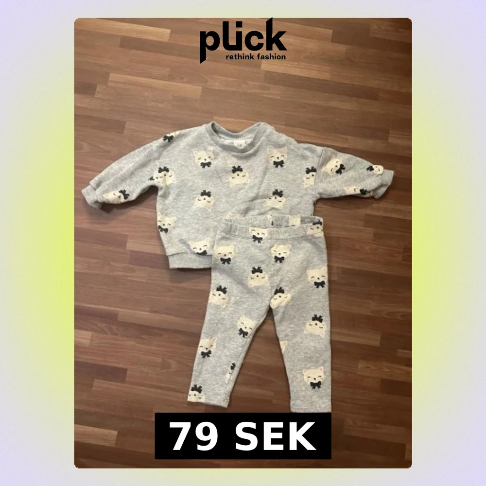 Supersöt grå sweatshirt och matchande byxor från H&M i storlek 74 (6-9mån). Knapp på axeln för enkel påklädning. Lite tjockare material. Fint skick.