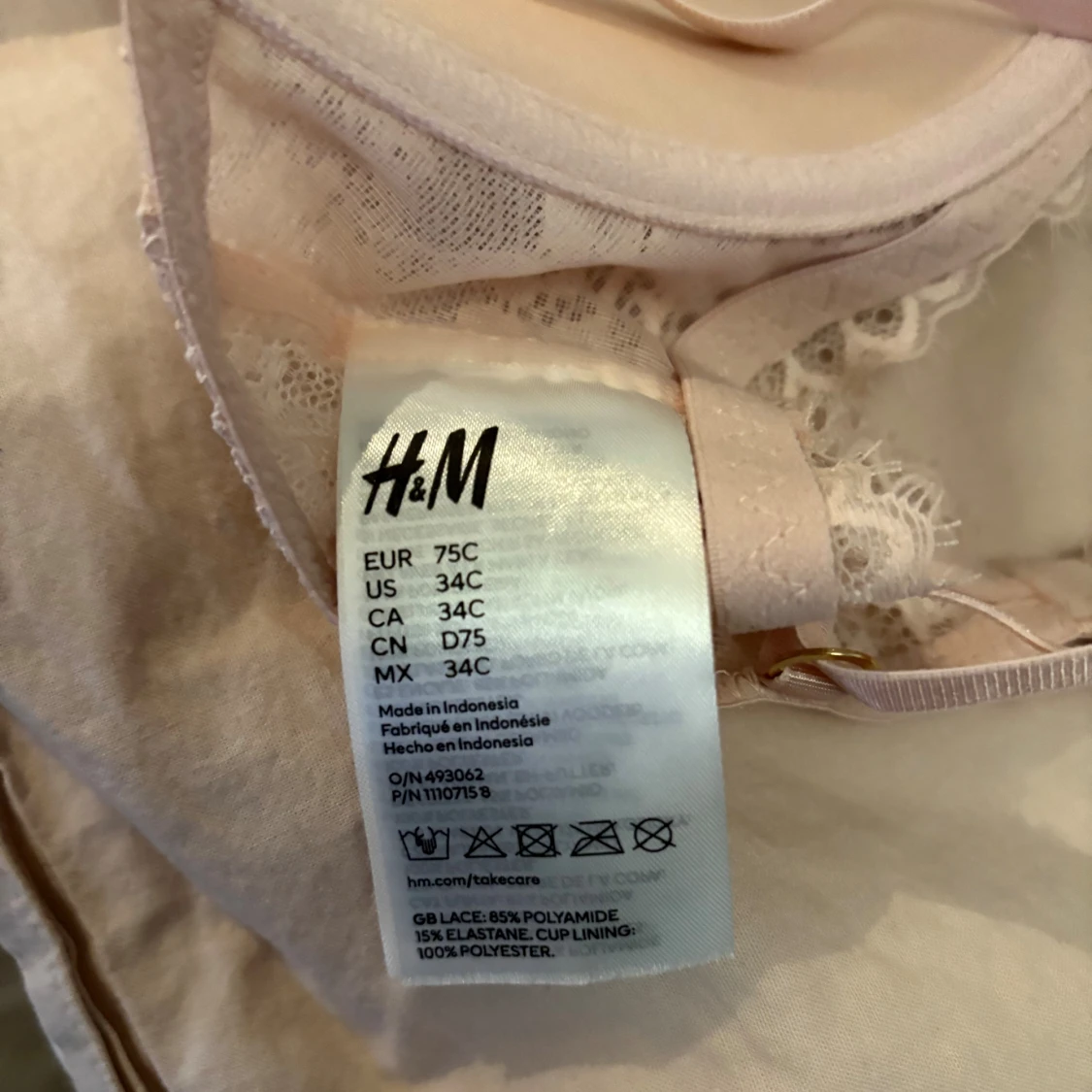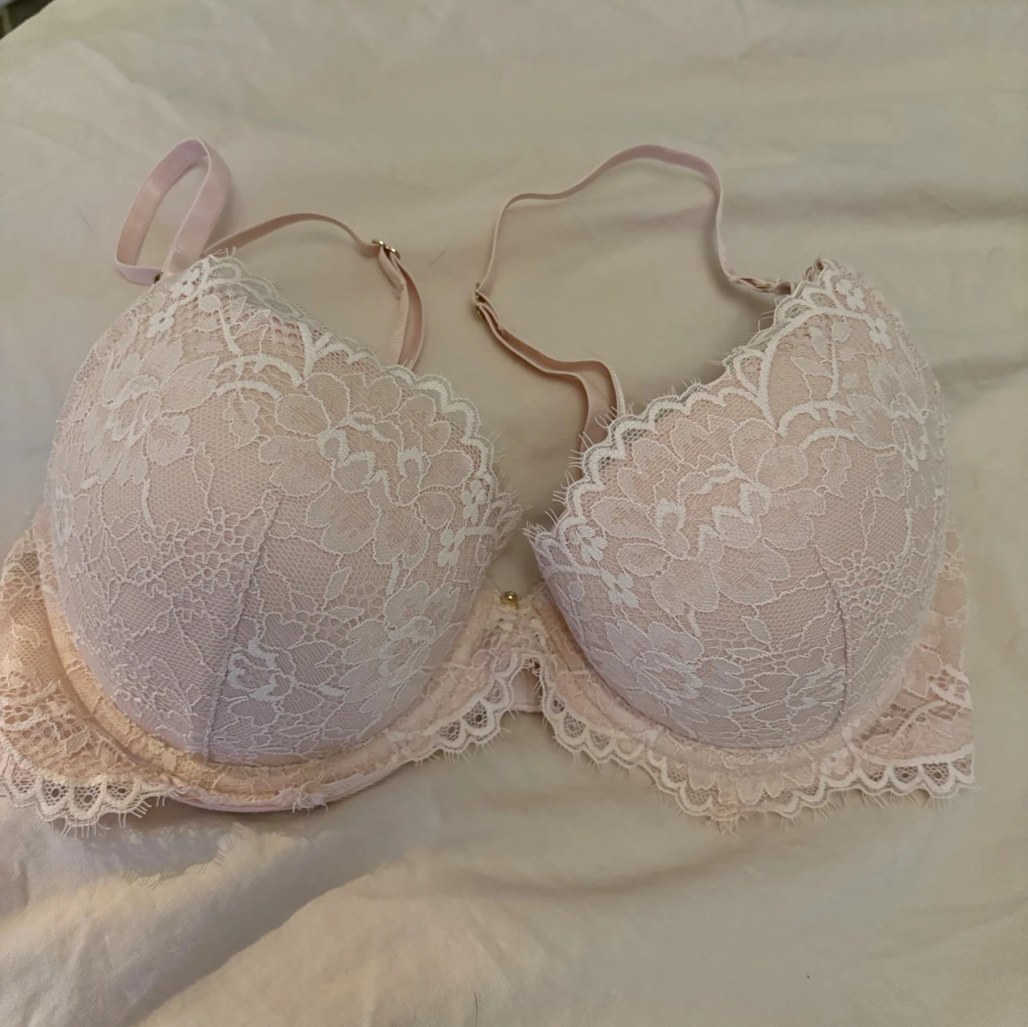 Säljer en ljusrosa bh från H&M i storlek 75C med vacker spets och blommigt mönster. Bh:n har justerbara axelband, dekorativ spetskant och en liten guldfärgad detalj mellan kuporna. Materialet är polyamid, elastan och polyester.
