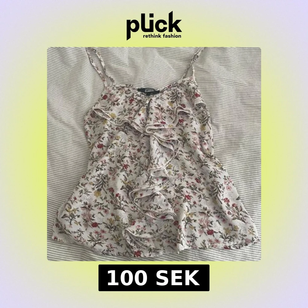 Supersöt linnetopp från Bik Bok med blommigt mönster i vitt, rosa, rött och gult. Toppen har tunna axelband och en stor volang framtill som ger en romantisk vibe. Perfekt för varma dagar och lätt att matcha med jeans eller kjol.