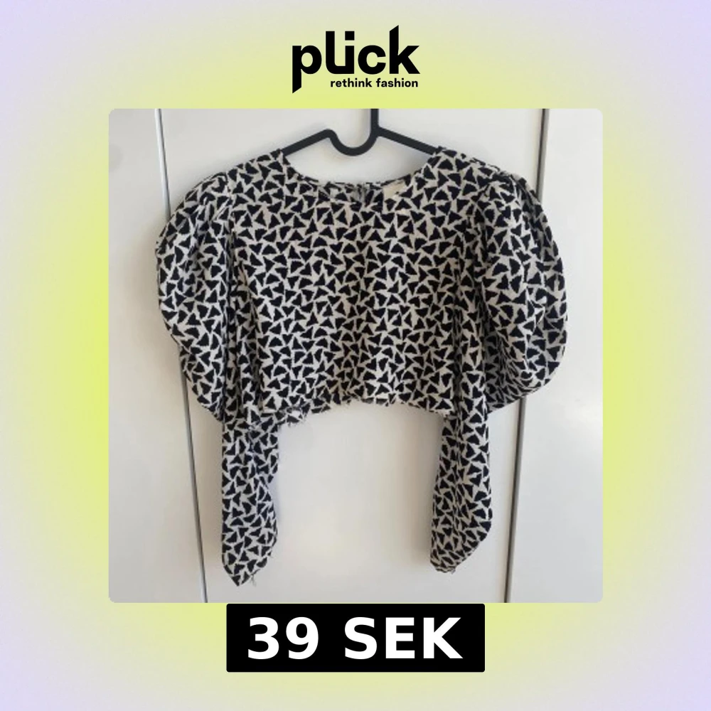 Säljer en svartvit blus från H&M med grafiskt mönster och puffiga långärmar. Blusen har croppad passform och långa band framtill som kan knytas. Har klippt av den från en klänning så om man vill är det bara att sy upp där nere vid magen om man vill. Perfekt för dig som vill sticka ut med en unik topp!
