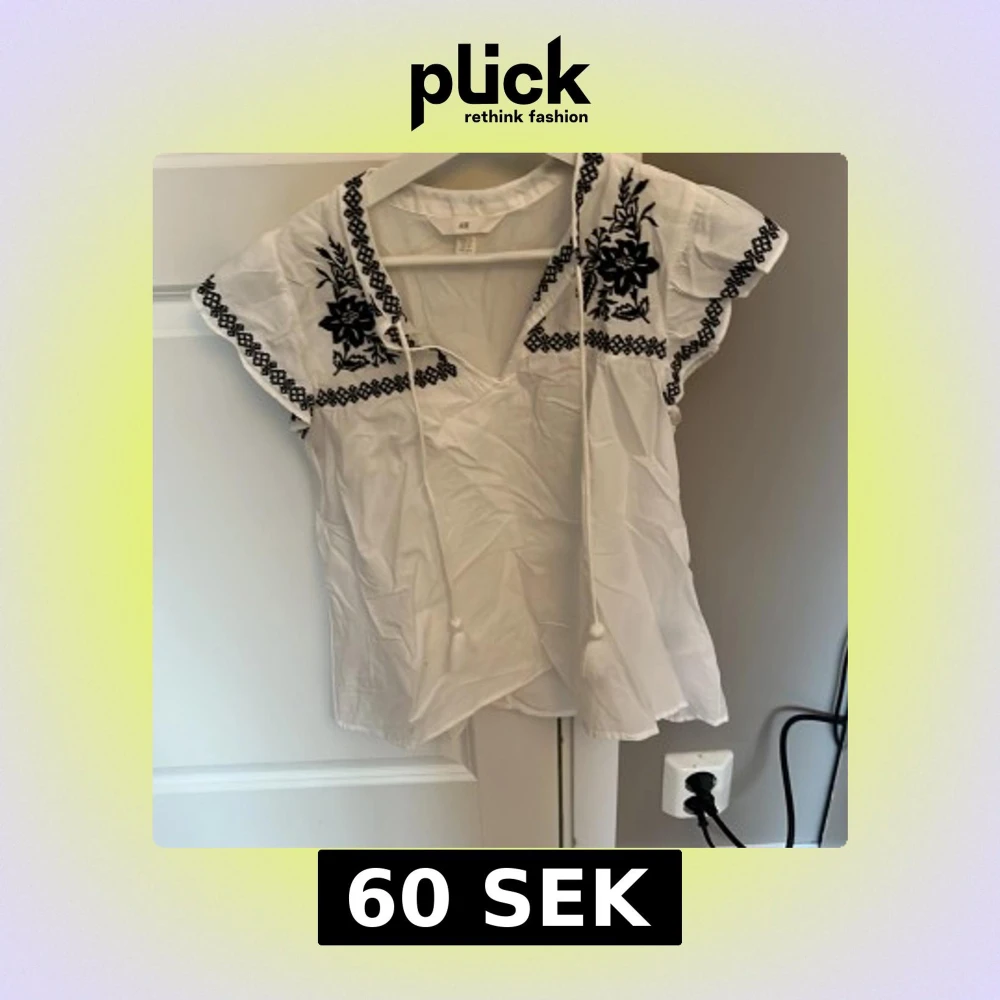 Säljer en vit blus från H&M med svart broderi och knytband framtill. Blusen har korta ärmar och ett vackert blommönster. Perfekt för en bohemisk look.