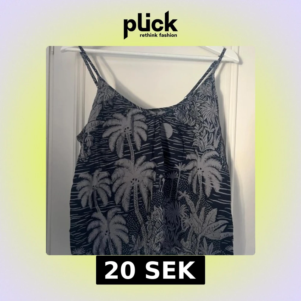 Säljer en snygg mörkblå linnetopp från H&M med ett tropiskt mönster av palmer i ljusgrått. Toppen har smala axelband och en avslappnad passform, perfekt för varma dagar.
