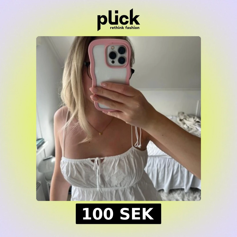 Säljer en söt vit linnetopp från H&M med tunna axelband och knytning framtill. Toppen har en luftig och lätt passform, perfekt för varma dagar. Enkel och stilren design som passar till mycket.