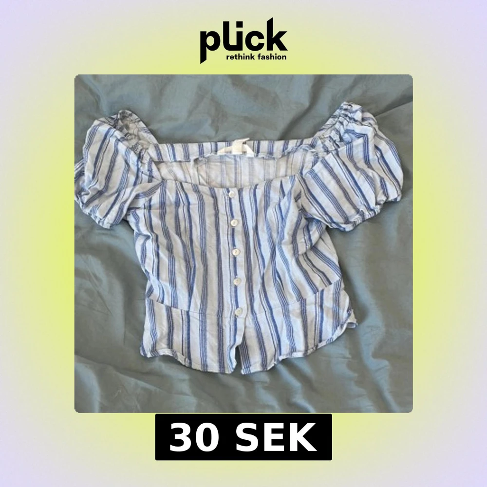 Säljer en söt blus från H&M i ljusblått och vitt med randigt mönster. Blusen har korta puffärmar och knappar framtill. Den har en volangdetalj vid nederkanten som ger en extra touch. Perfekt för en somrig look! 🌸