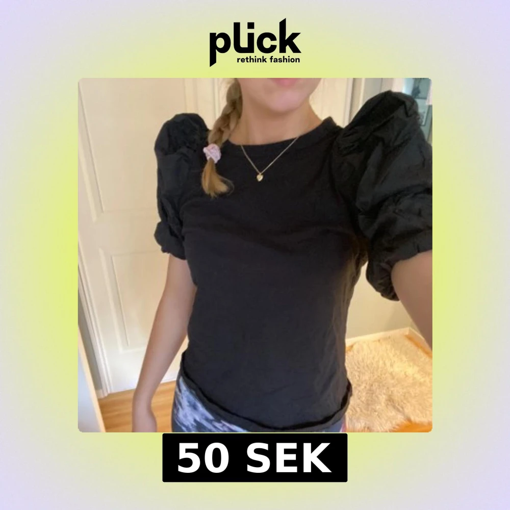 Säljer en stilren svart topp med puffiga kortärmar. Toppen har en rund halsringning och är gjord i ett mjukt material.