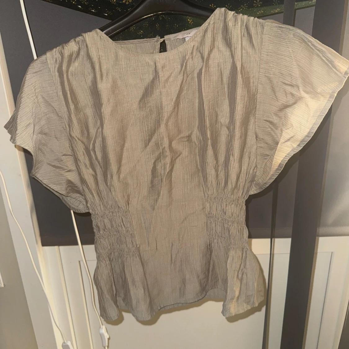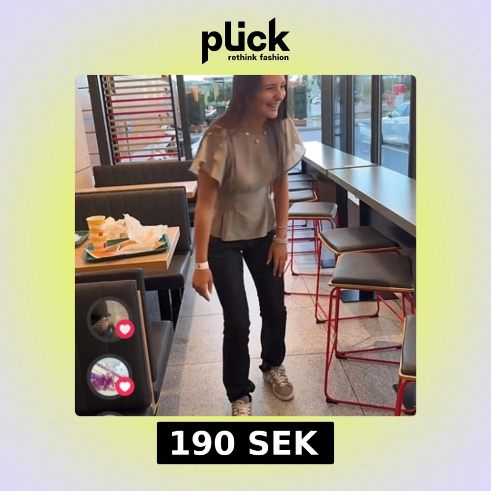 Säljer en stilren grön blus med korta ärmar och elastisk midja. Perfekt för en avslappnad men ändå elegant look. Blusen har en rund hals och är lätt att matcha med olika outfits.