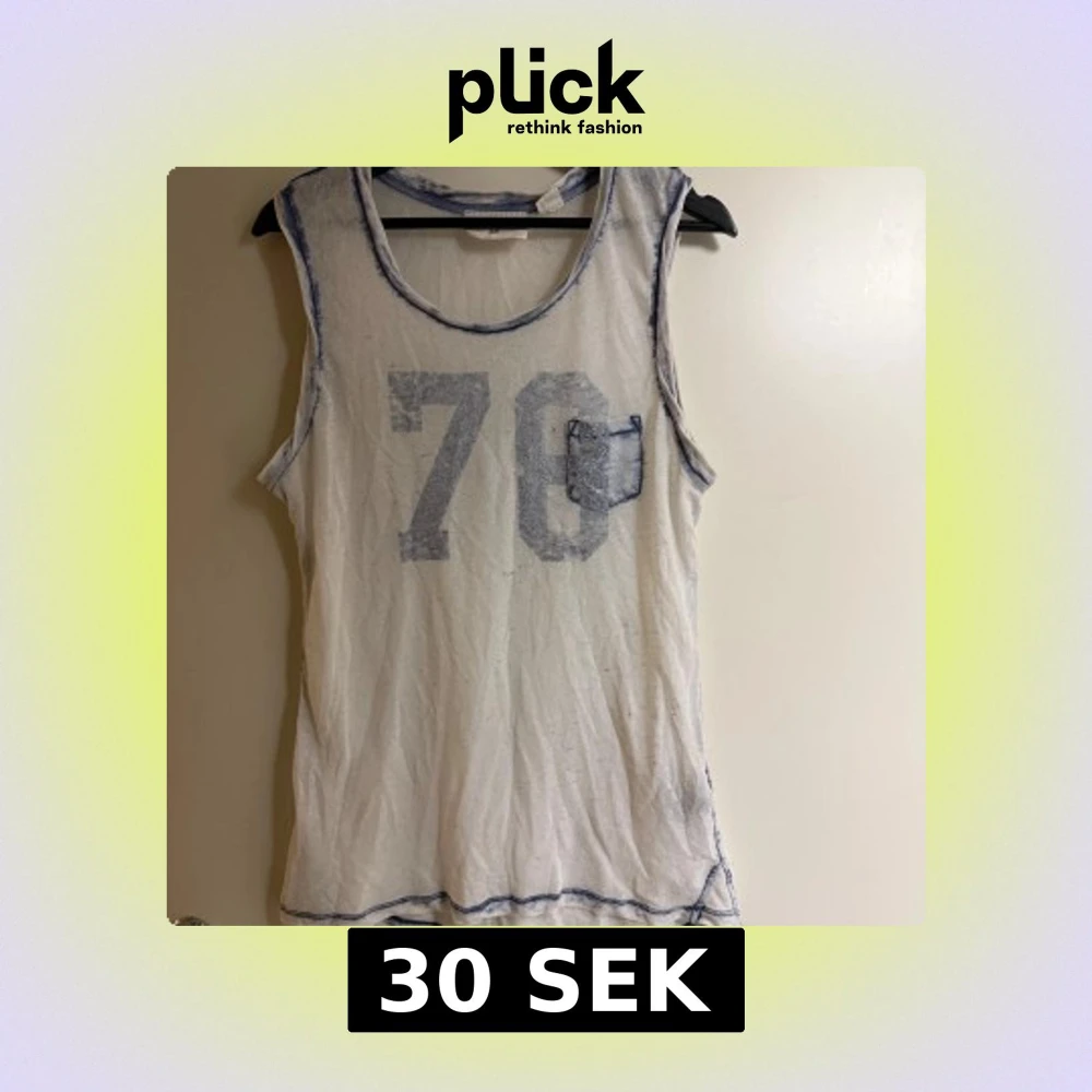 Säljer en vit ärmlös topp från H&M med blå detaljer och ett stort tryck av siffran 70 på framsidan. Toppen har en liten bröstficka och är perfekt för en avslappnad stil.