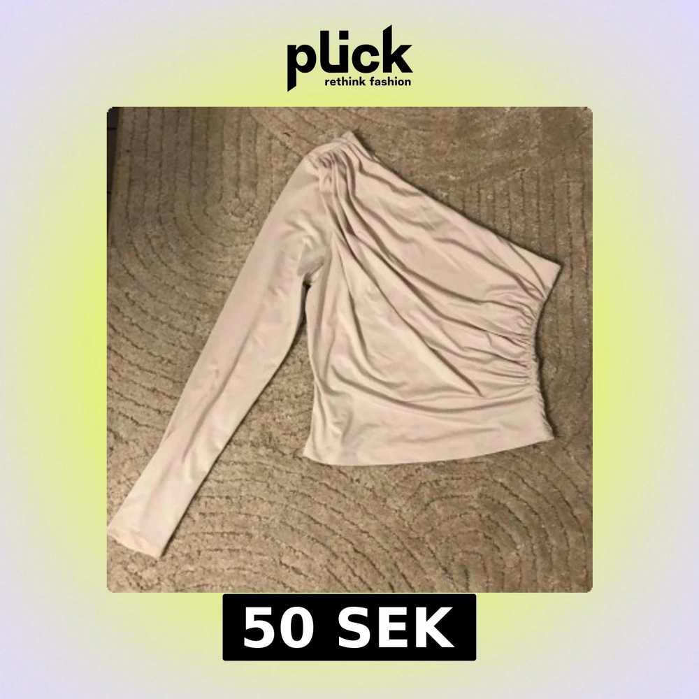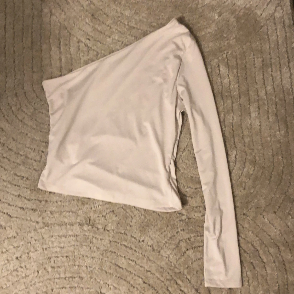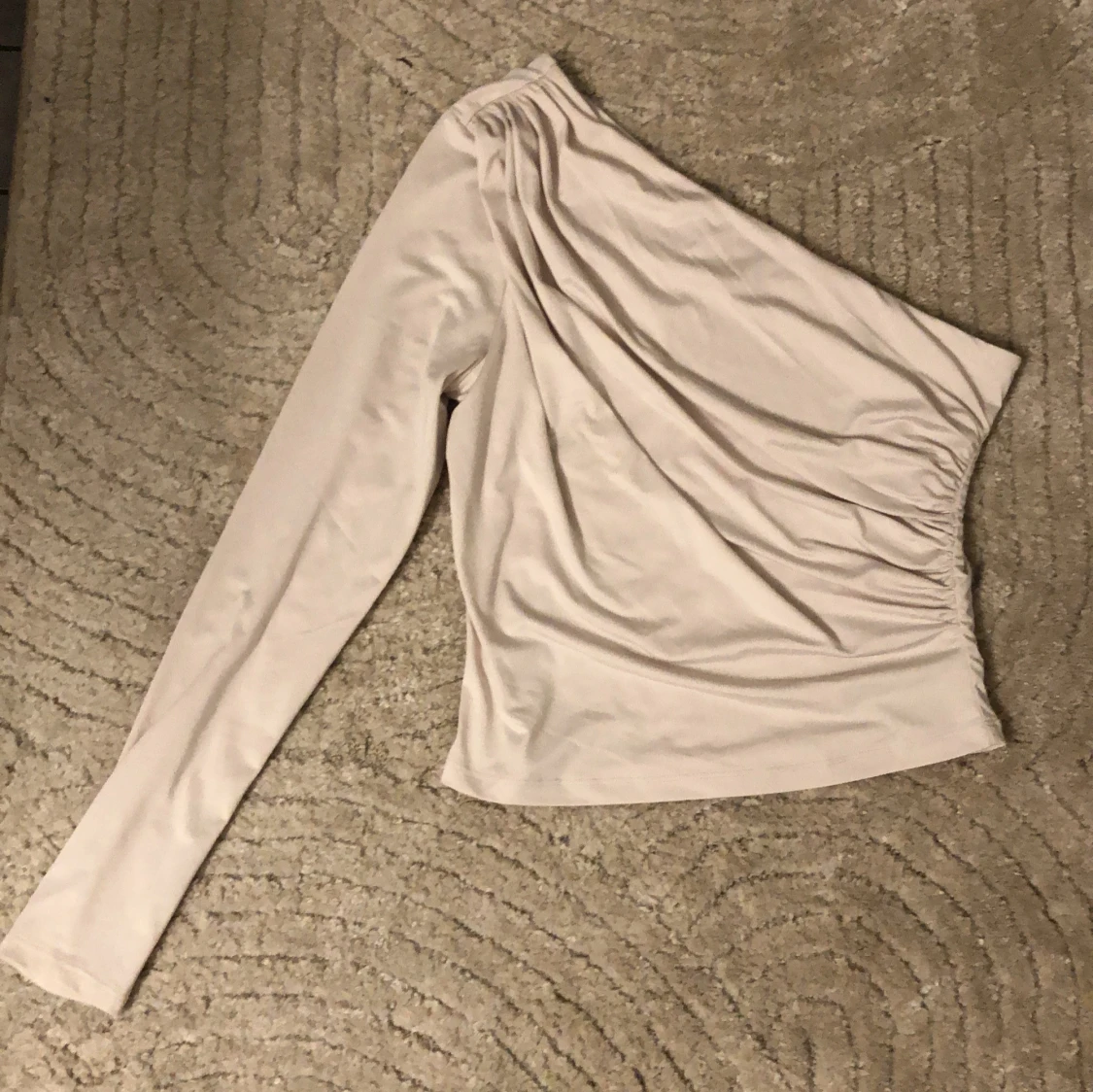 Säljer en stilren beige oneshoulder topp från H&M. Toppen har en lång ärm och en elastisk midja för en bekväm passform. Perfekt för en trendig look.