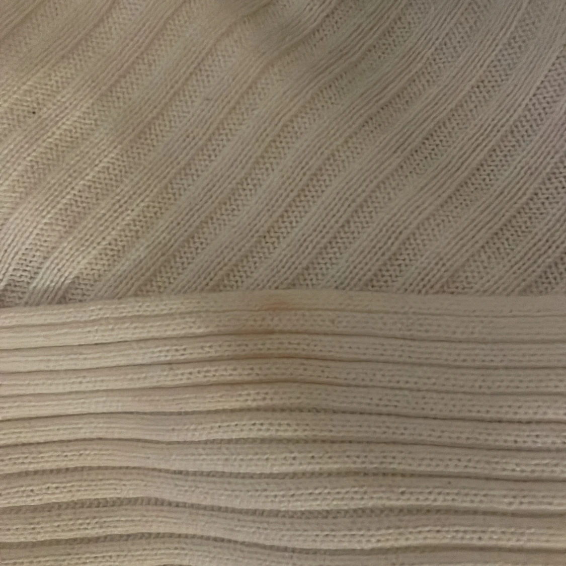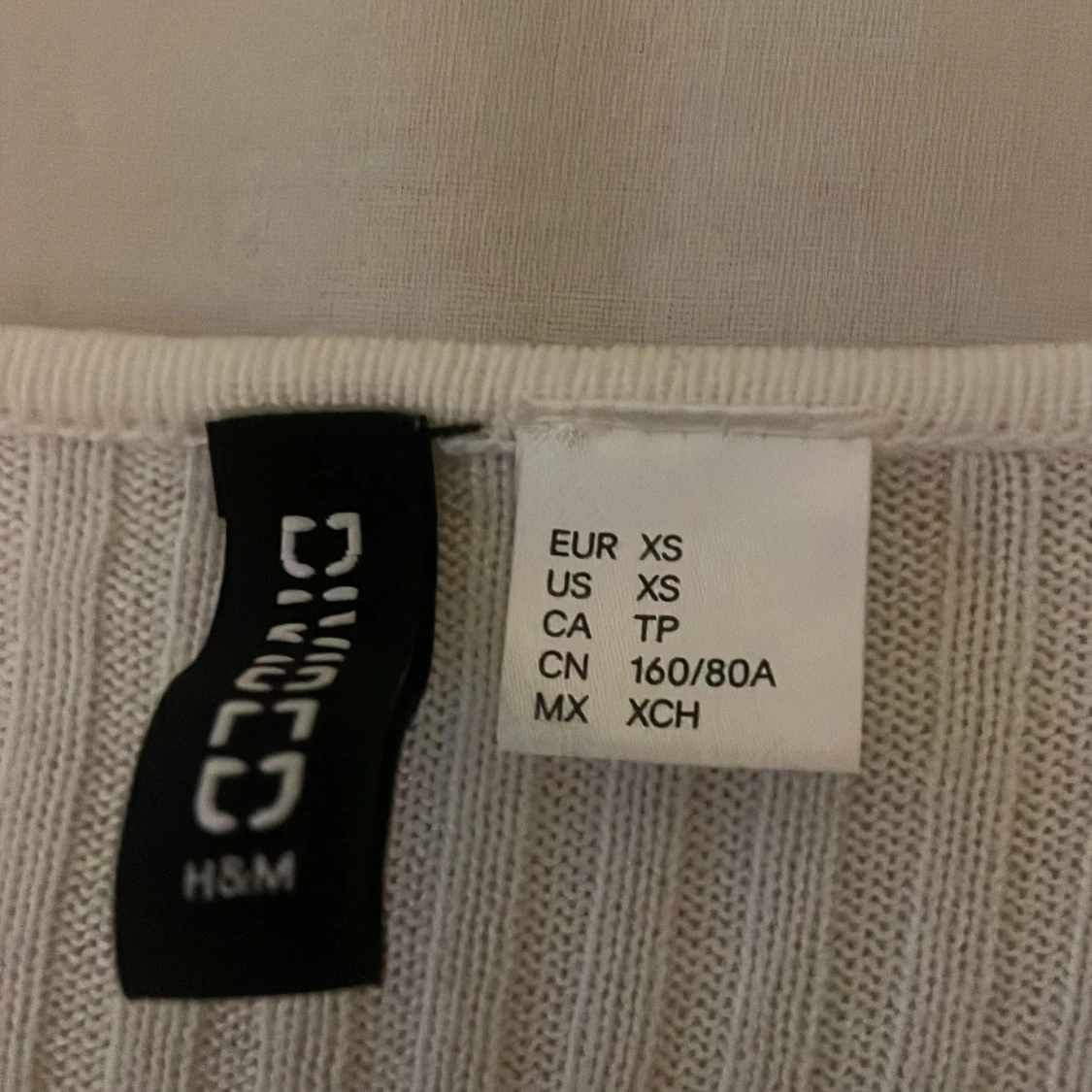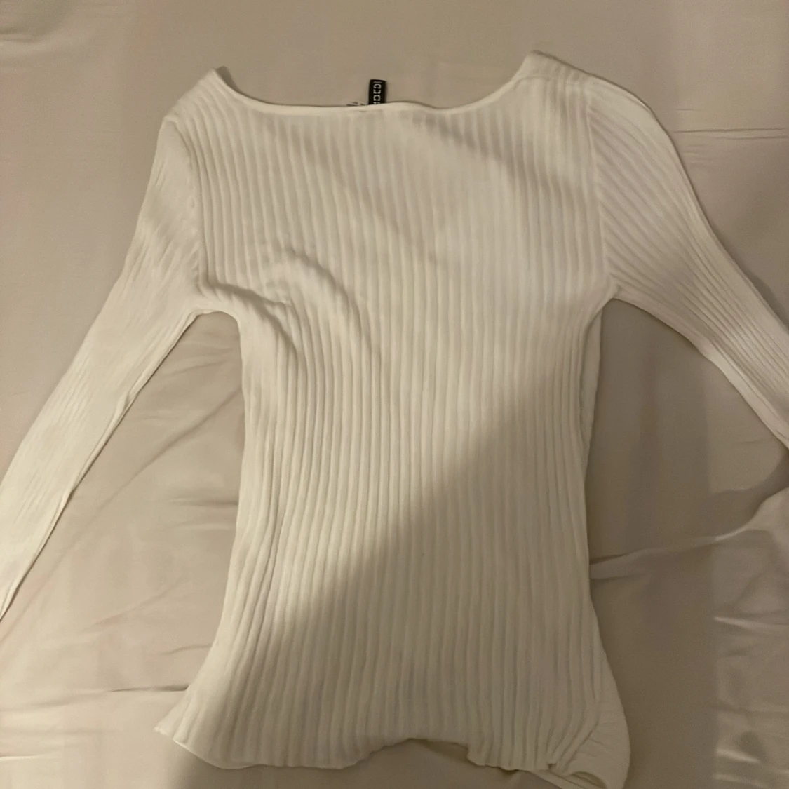 Säljer en vit ribbad omlottopp från H&M i storlek XS. Toppen har lång ärm, v-ringning och omlottdesign framtill. Materialet är stretchigt och bekvämt, perfekt för att skapa en stilren look. Finns en liten fläck på toppen men går säkert att få bort☺️