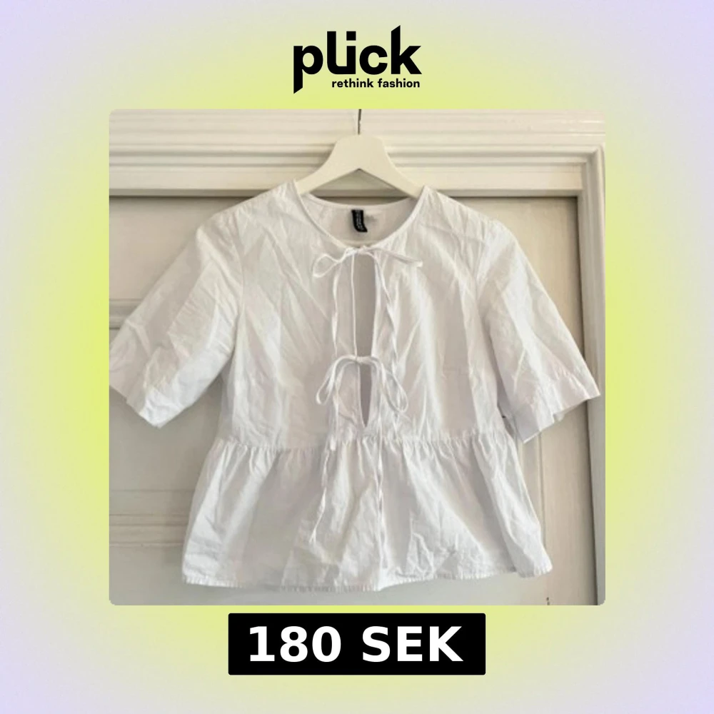 Säljer en söt vit blus från H&M med knytband framtill och korta ärmar. Blusen har en luftig passform och är perfekt för varmare dagar.