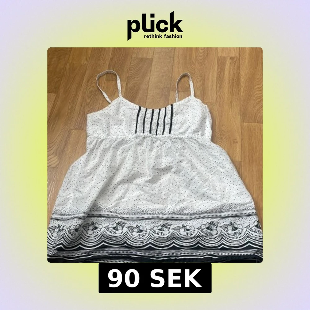 Säljer en söt vit linnetopp från H&M med svarta prickar och blommigt mönster längst ner. Toppen har tunna axelband och dekorativa veck framtill. Perfekt för varma dagar och enkel att matcha med jeans eller kjol.
