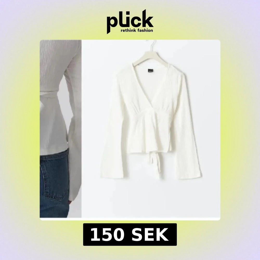 Säljer en fräsch vit omlottopp från Gina med v-ringning och långa ärmar. Toppen har ett snyggt knytband i midjan som ger en feminin siluett och lätt ribbad struktur i tyget. Perfekt att styla med jeans eller kjol för en clean look.