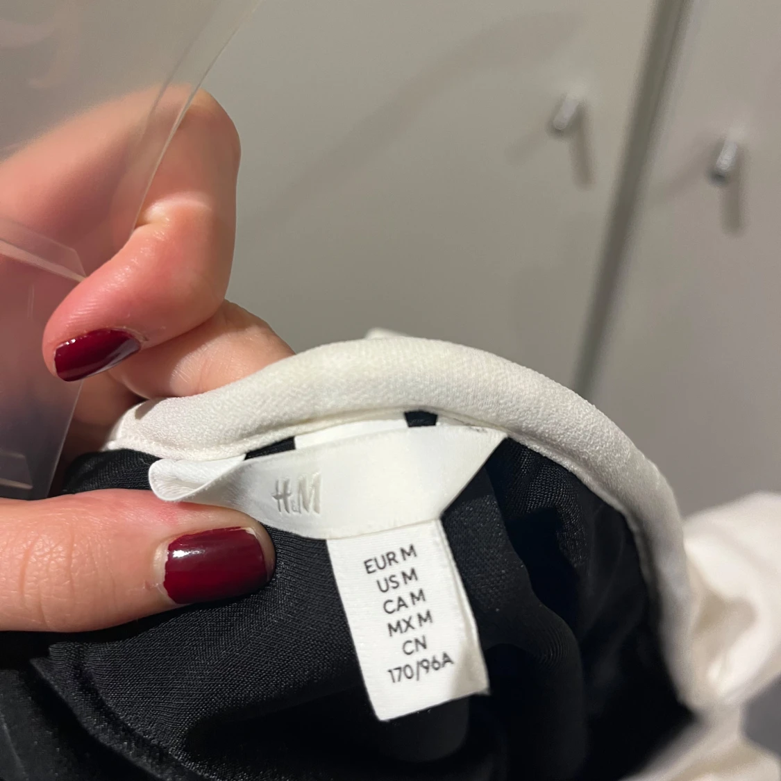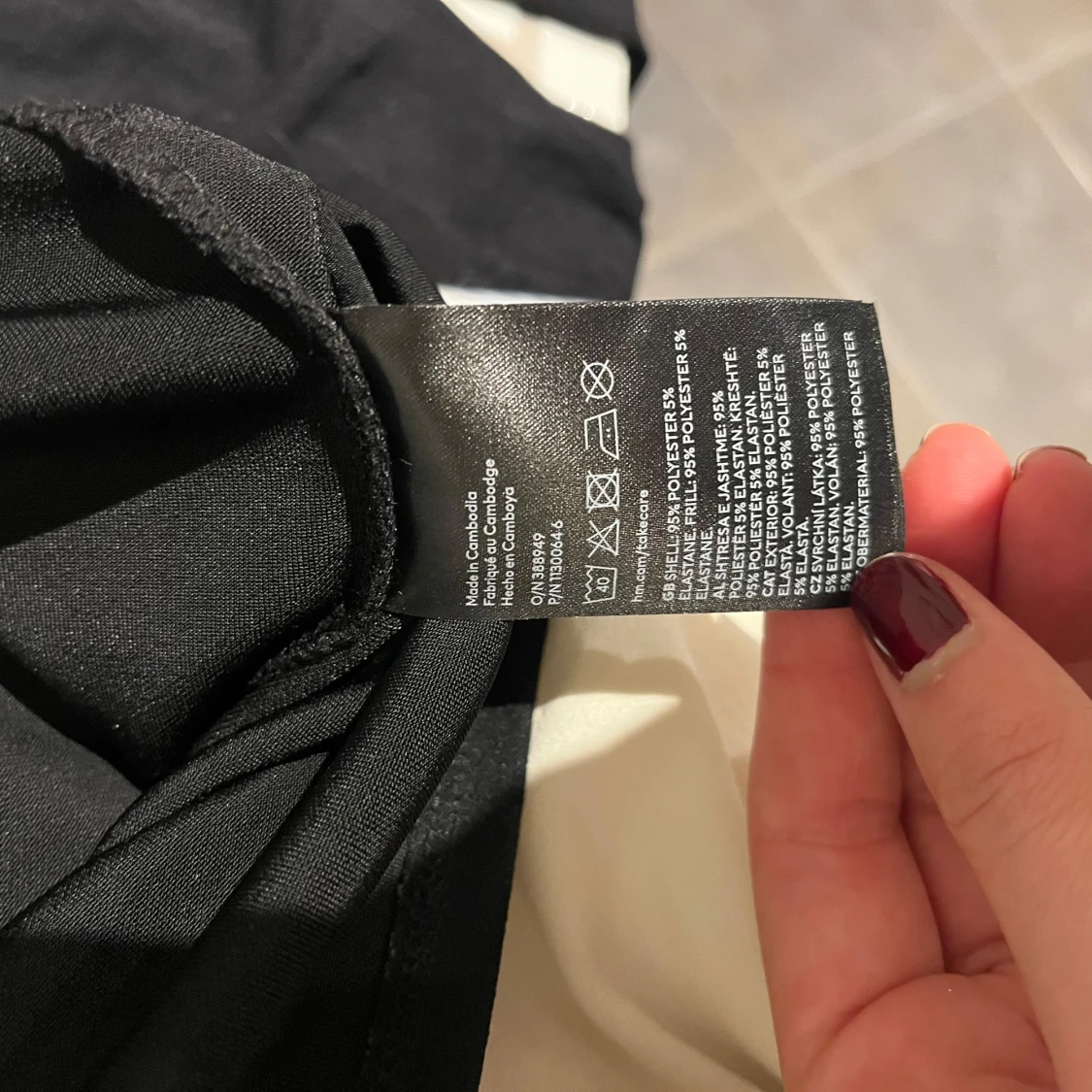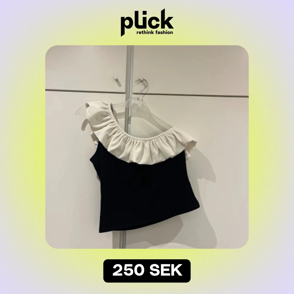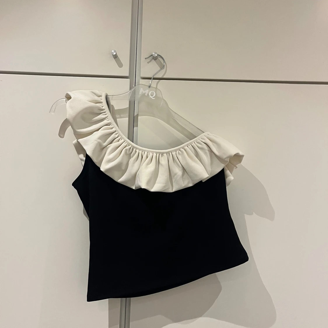 Volangtopp i svart med vit volang. Är oneshoulder. Strl M. Använd 1 gång, tvättad 1 gång. Nyskick.