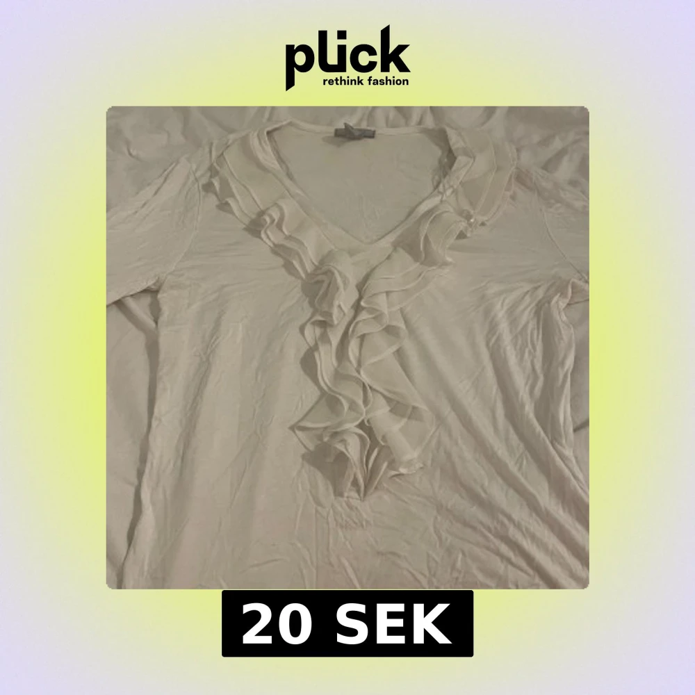 Supersöt vit blus från H&M i storlek L med v-ringning och snygga volanger längs halsen och framtill. Långärmad och tillverkad i mjuk bomull, perfekt för dig som gillar romantiska detaljer och vill ha en chill men ändå stylish look.