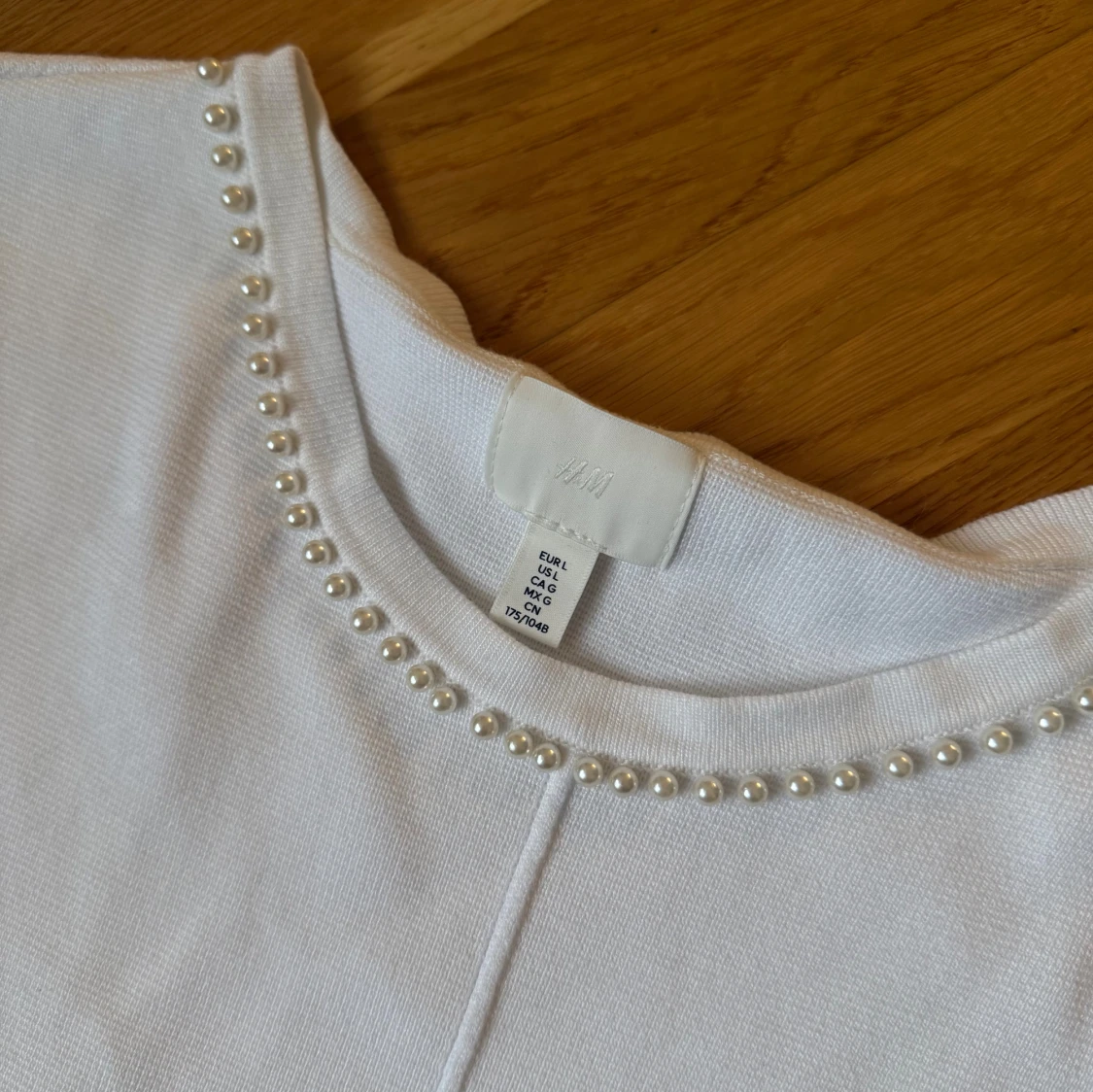 Säljer en vit ärmlös topp från H&M med rund halsringning dekorerad med pärlor. Toppen har en rak passform och är tillverkad i ett mjukt, stickat material. Perfekt för att lyfta en enkel outfit med lite extra detalj.