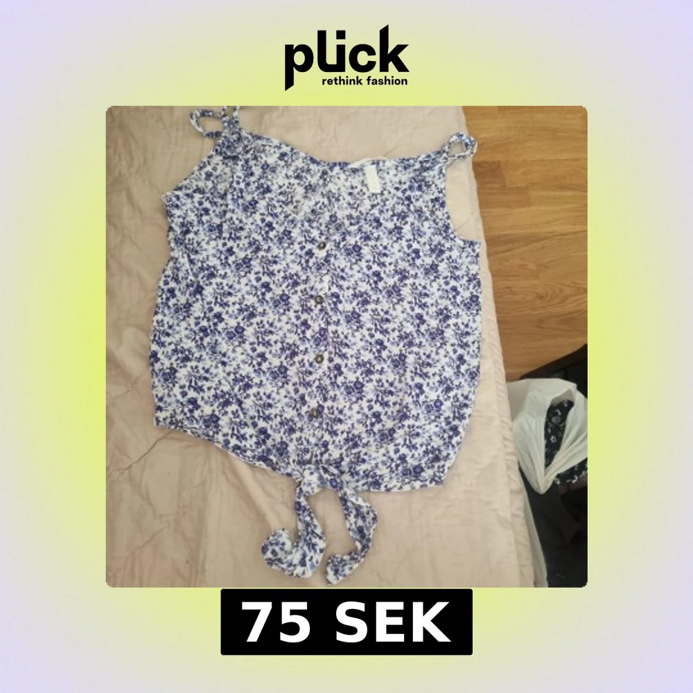 Supersöt blommig linnetopp i vitt med blått mönster. Toppen har knyt framtill, knappar längs hela framsidan och smala axelband. Perfekt för varma dagar och ger en fräsch vibe till din outfit.