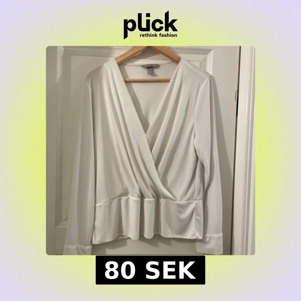 Säljer en stilren vit omlottblus från H&M med lång ärm och djup v-ringning. Blusen har en snygg draperad effekt framtill och bredare fåll nedtill.