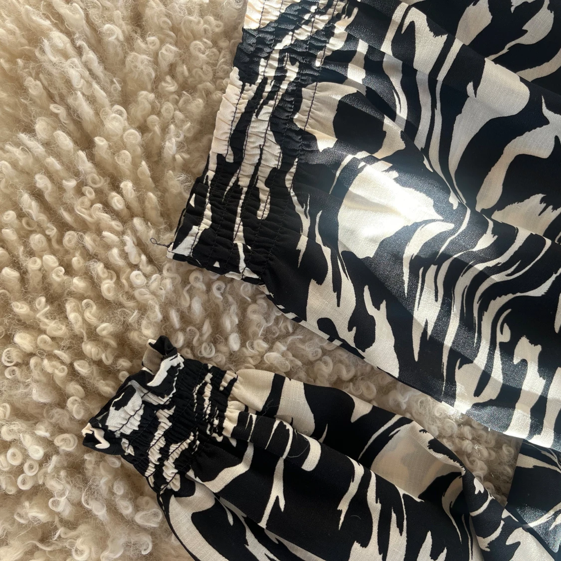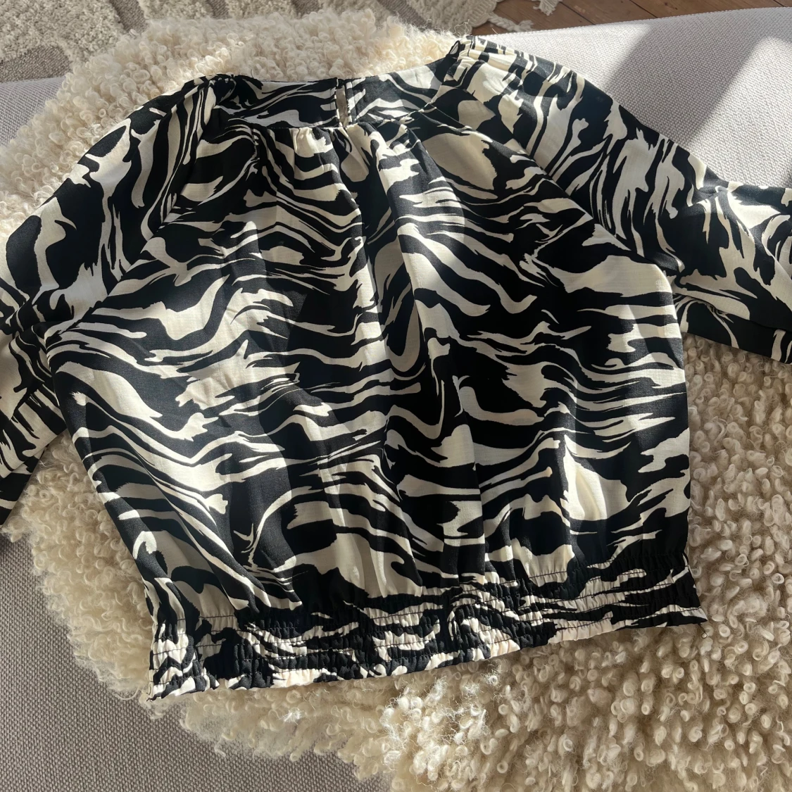 Säljer en svartvit blus från H&M i storlek M, men sitter som en S. Blusen har långa ärmar med resår vid ärmslut och midja, vilket ger en snygg puffig effekt. Materialet är lätt och känns skönt mot huden. Använd en gång!
