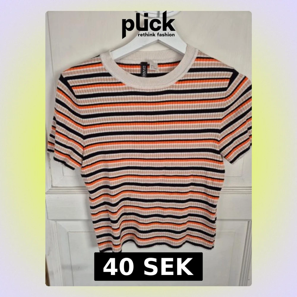 Säljer en ribbad topp från H&M med korta ärmar och rund hals. Toppen har ett färgglatt randigt mönster i orange, svart, beige och vitt. Perfekt för dig som gillar en retroinspirerad stil med lite edge.