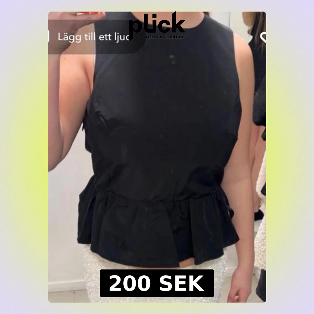 Snygg svart ärmlös topp med volang nedtill och stor rosett i ryggen. Toppen har öppen rygg och är croppad, vilket ger en trendig och ungdomlig look. Perfekt att styla med kjol eller jeans för en cool outfit.