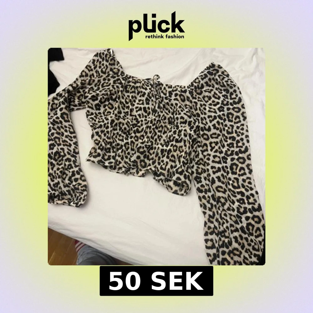Säljer en snygg leopardmönstrad blus från H&M med offshoulder och långa, vida ärmar. Toppen är croppad och har volangdetaljer som ger en cool och trendig look. Perfekt för dig som vill sticka ut med ett djurmönster!