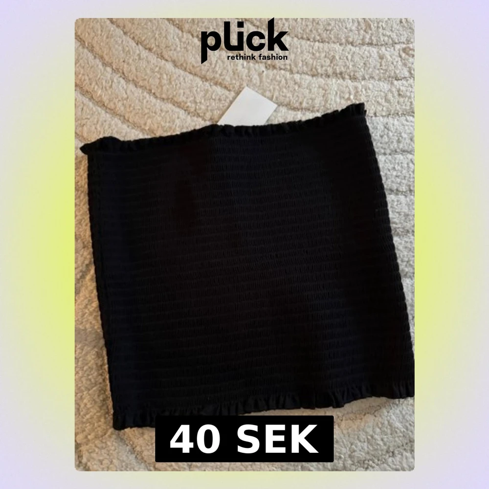 Säljer en svart smockad tubtopp med stretchig passform och små volangdetaljer upptill och nedtill. Perfekt att styla till jeans eller kjol för en trendig look. Enkel och stilren design som passar till mycket.