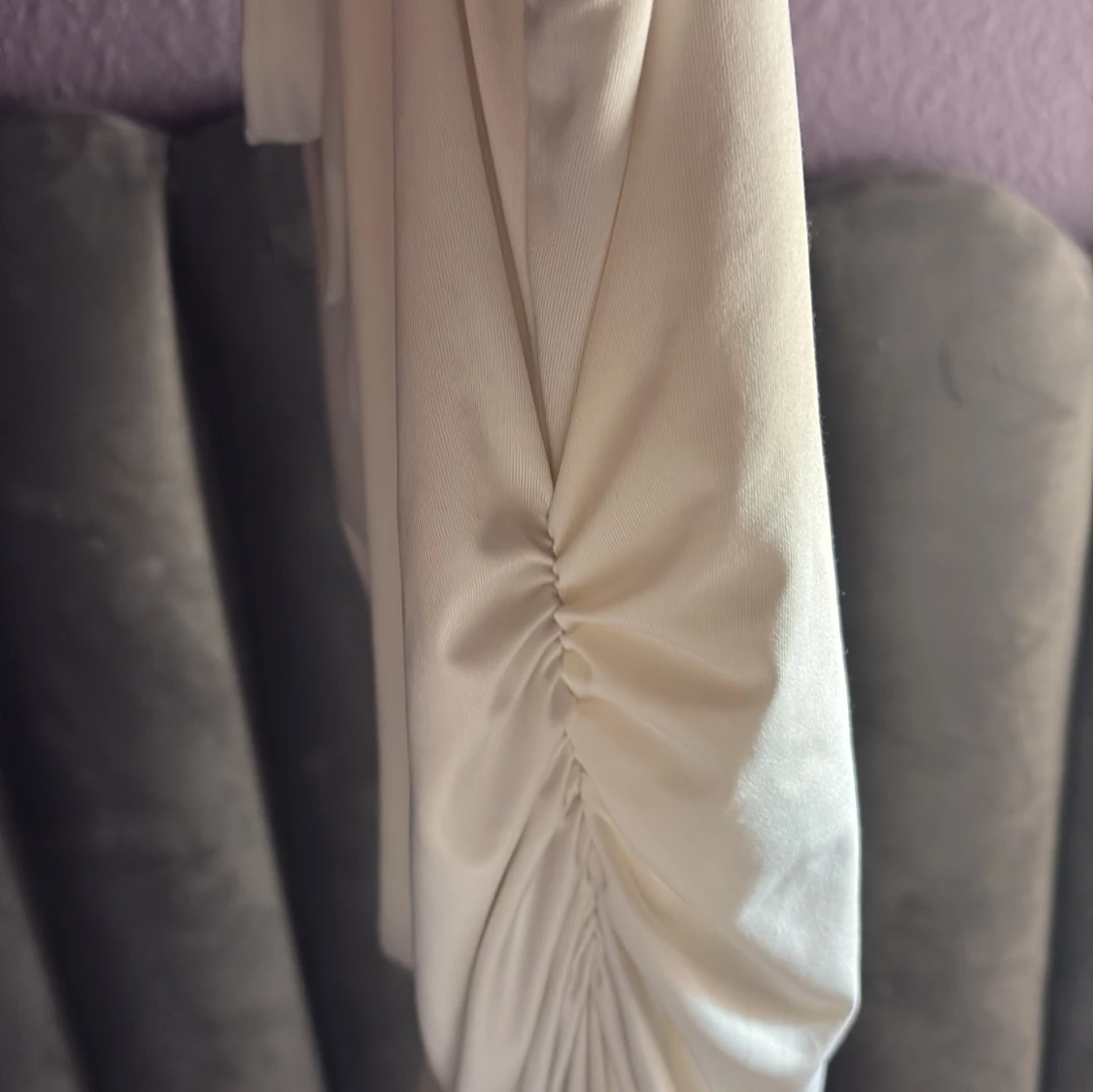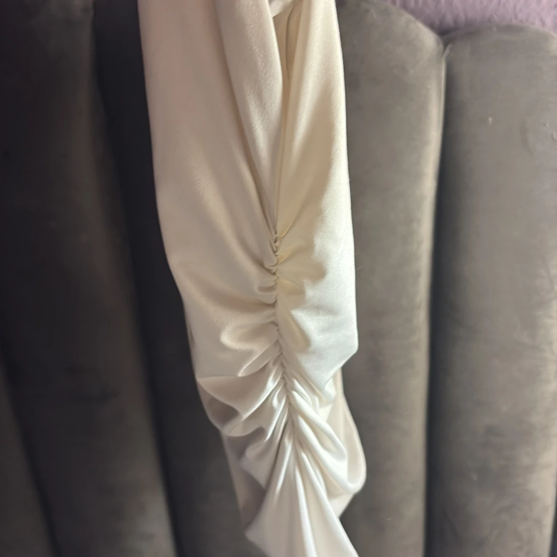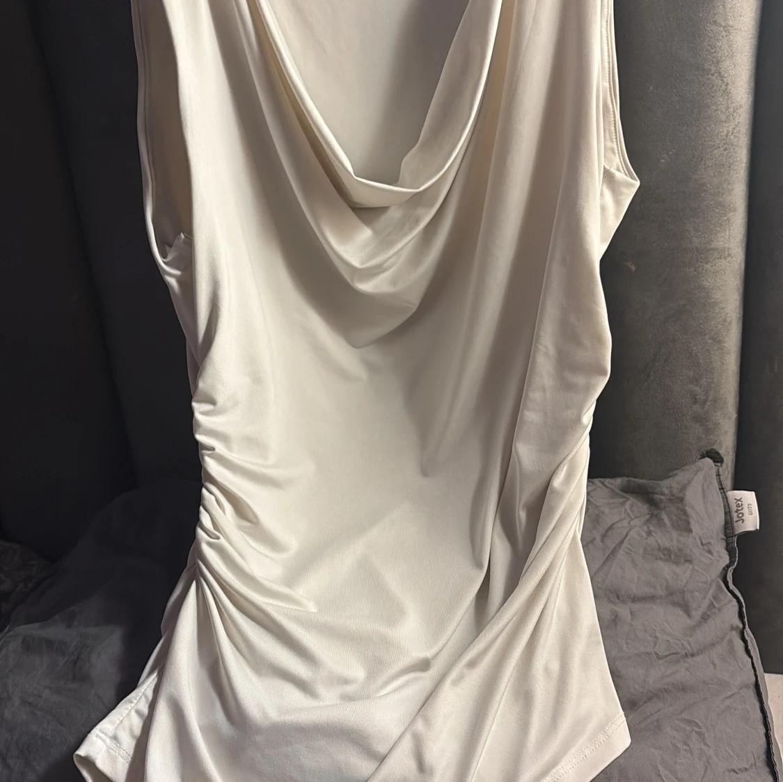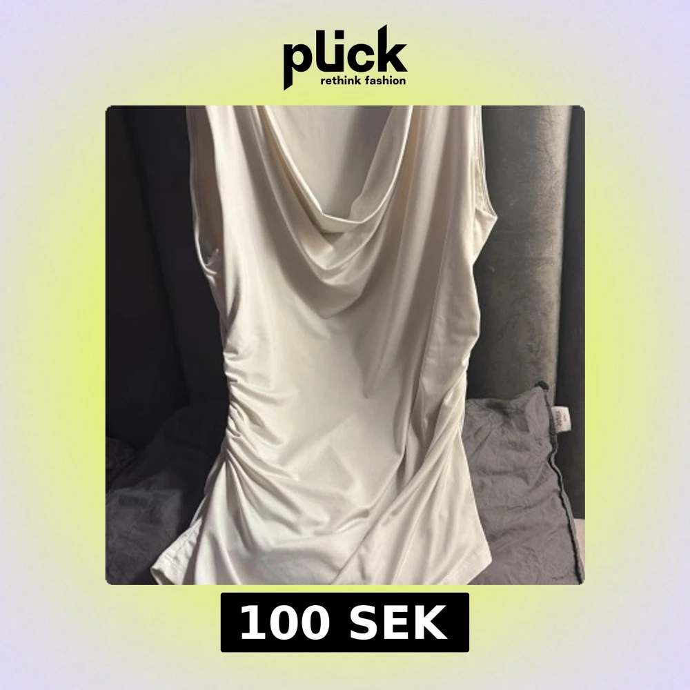 Säljer en vit linnetopp från H&M med snygg draperad halsringning och omlott-effekt. Toppen är ärmlös och har cool rynkning på sidan som ger en extra touch. Materialet är mjukt och har lite glans, perfekt för att lyfta din outfit.
