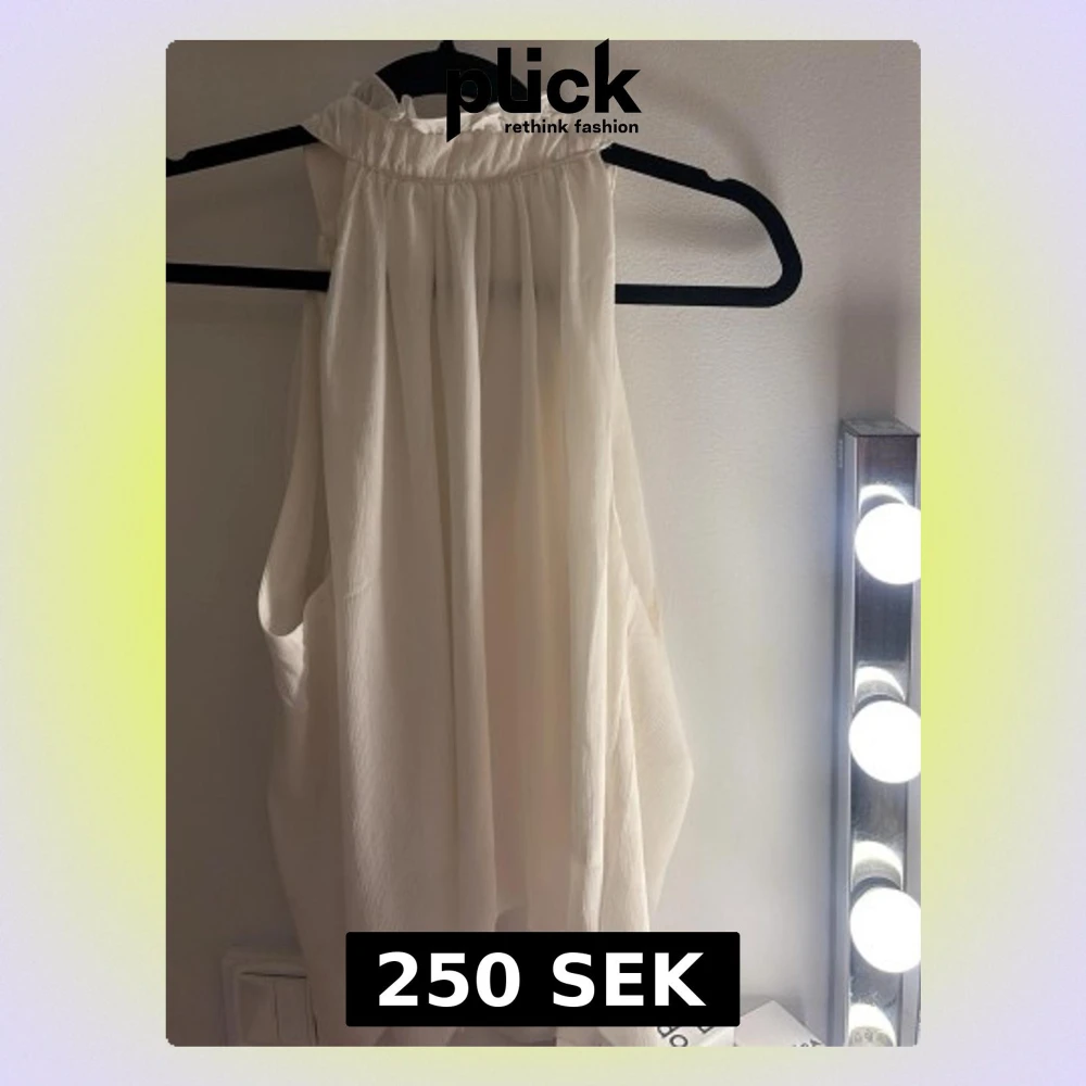 Säljer en luftig vit blus från H&M med hög krage och fina veckade detaljer. Toppen är ärmlös och har ett elegant fall, perfekt för att styla med jeans eller kjol. Materialet känns lätt och svalt, vilket gör den superbekväm.