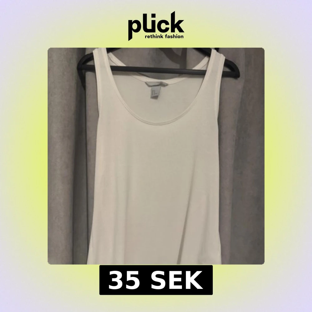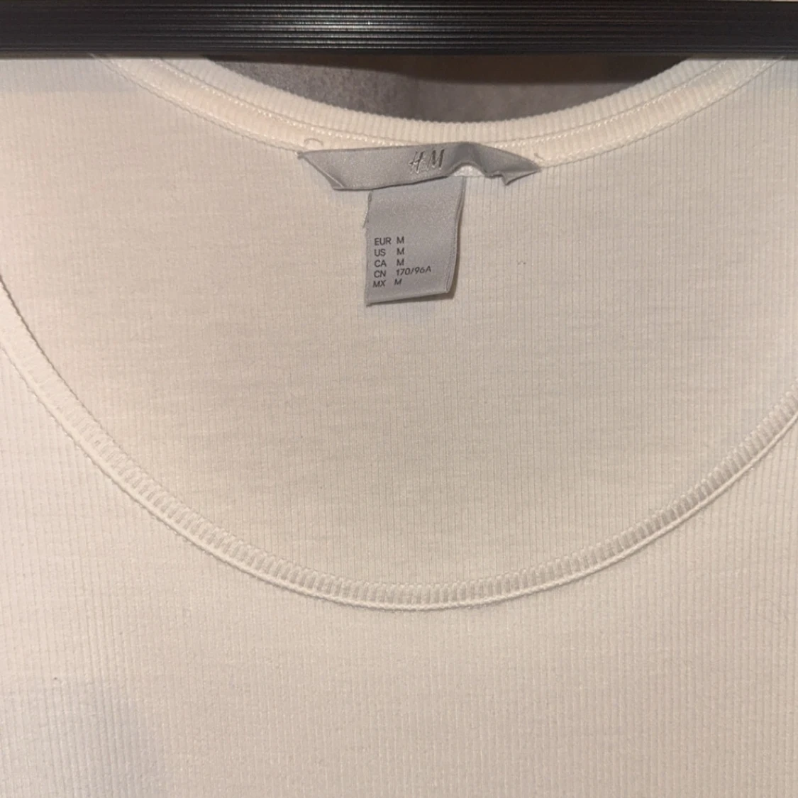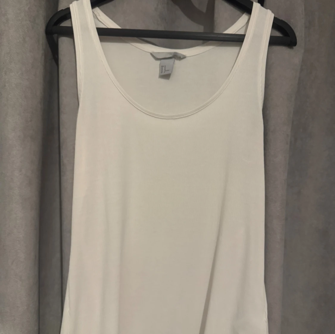Säljer en vit ribbad linnetopp från H&M i storlek M. Toppen har rund halsringning och ärmlös design, perfekt för att styla med jeans eller shorts. Materialet är mjukt och stretchigt för en skön passform. Enkel och clean look som funkar till många outfits.