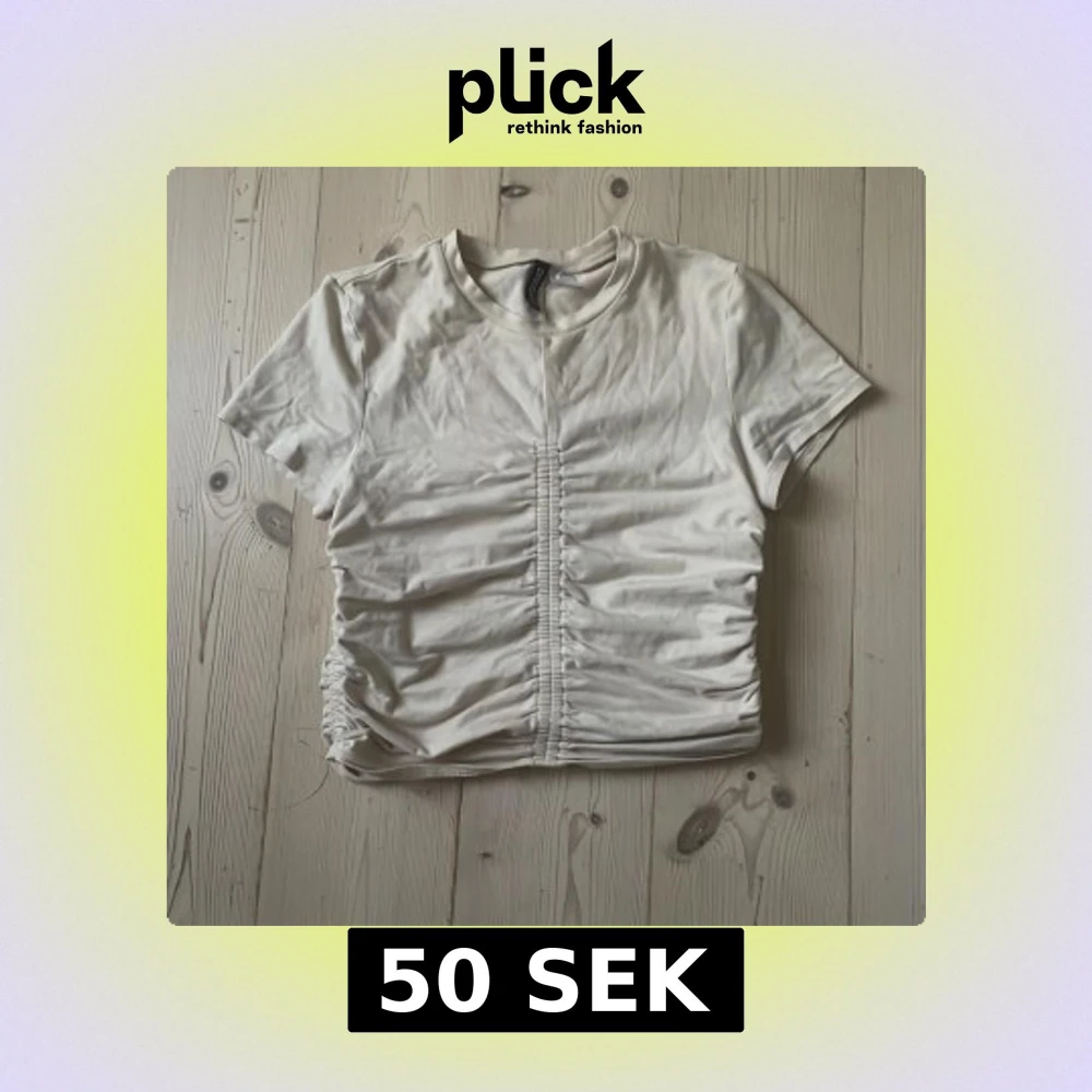 Kortärmad beige topp från H&M med snörningsdetalj längs hela framsidan, backsida och på sidorna. Modellen är figurnära och har en lätt croppad passform.