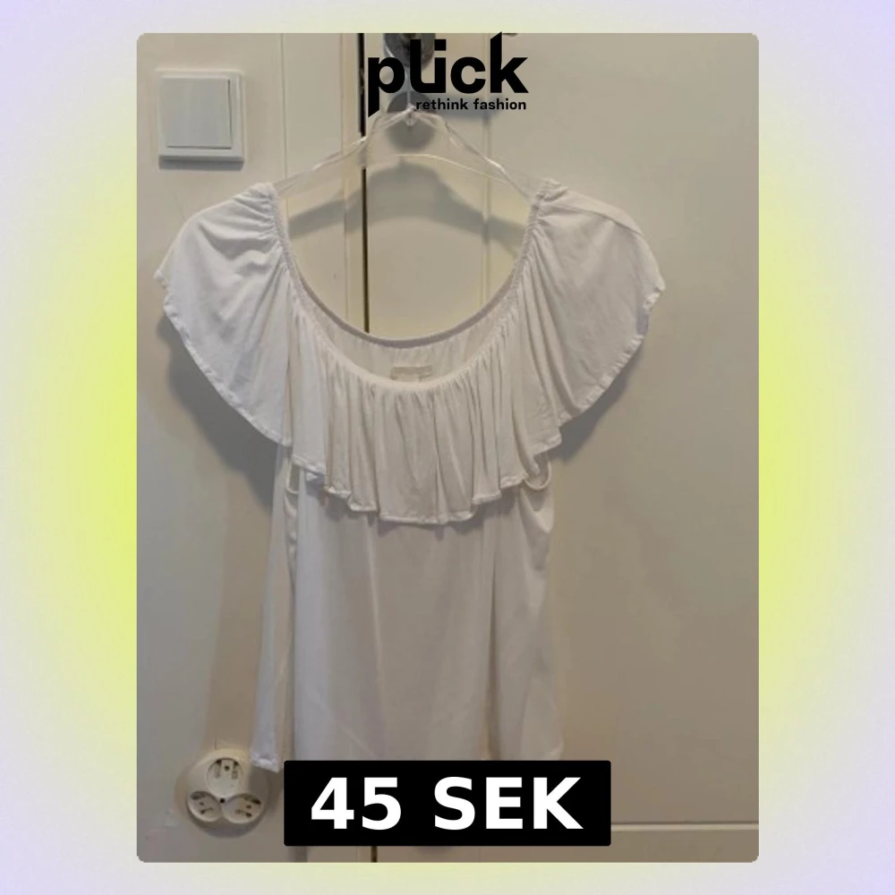 Säljer en vit topp från H&M i storlek M. Toppe har bred volang runt halsringningen och är offshoulder med omlott-design. Tillverkad i mjuk och lätt viskos som ger ett luftigt intryck. Perfekt för varma dagar och sommarhäng. Aldrig använd dock tvättad en gång