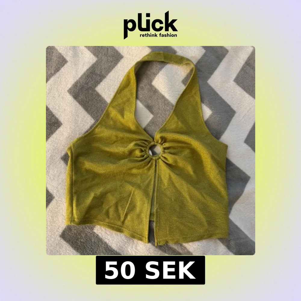 Snygg glittrig gul halterneck topp med ringdetalj framtill och öppen slits nertill. Toppen är croppad och har en ärmlös design som går runt nacken. Perfekt för dig som vill sticka ut med en cool och trendig look. Toppen är aldrig använd.