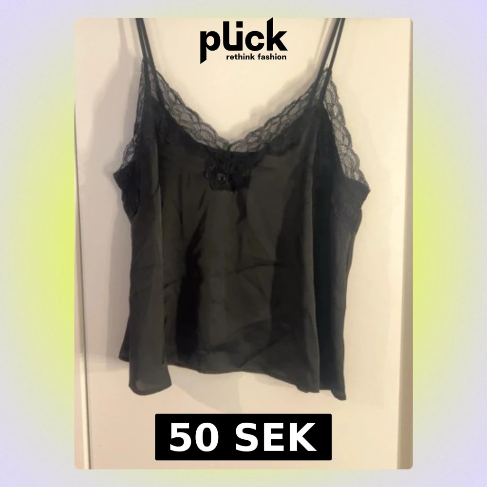 Snyggt svart linne med tunna axelband och spetsdetaljer längs urringningen och axelpartiet. Tillverkat i ett lätt, glansigt tyg som ger en lyxig känsla. Perfekt att styla lager på lager eller bära som det är för en trendig look.