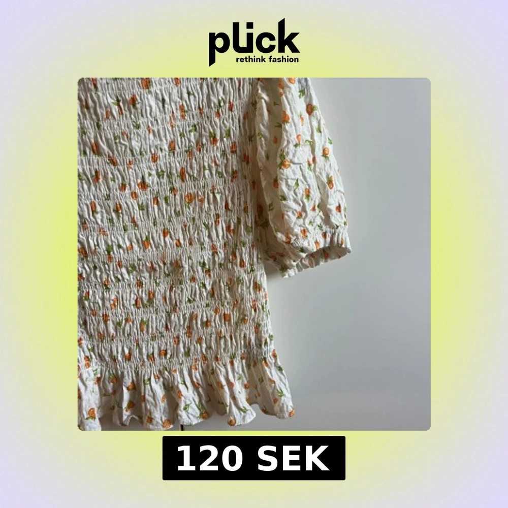 Supersöt fintröja från H&M Divided i vitt med orange och grönt blommigt mönster. Den har puffiga trekvartsärmar, smockad överdel och volangkant nedtill.