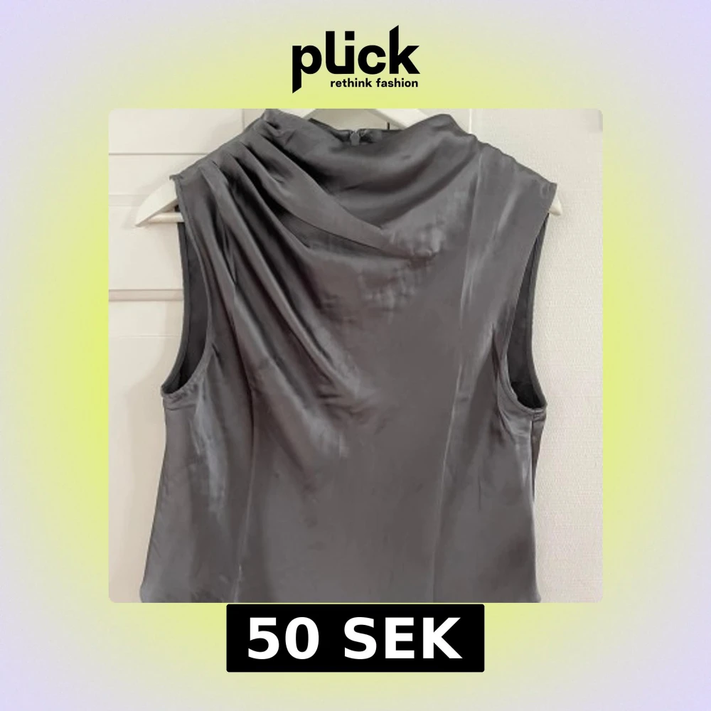 Snygg grå/silver blus i satin från H&M med draperad detalj vid axeln och hög hals. Ärmlös modell med diskret dragkedja bak🩶🪩