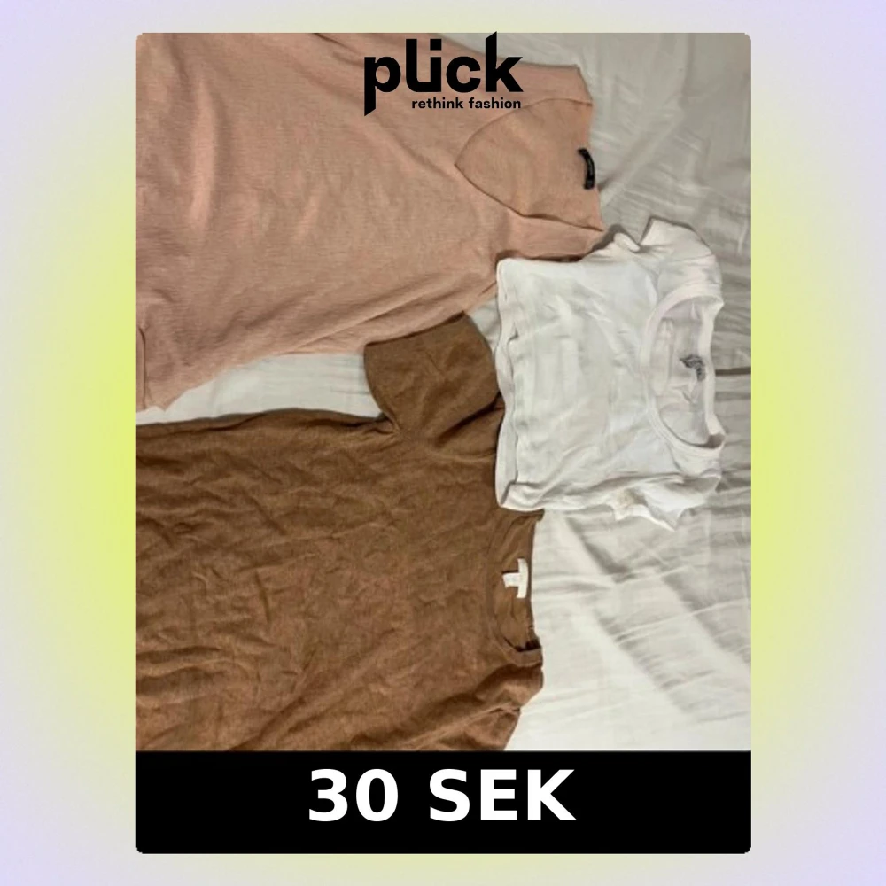 Säljer ett paket med tre toppar: en beige ärmlös linnetopp med v-ringning, en vit croppad t-shirt och en brun t-shirt. Perfekta basplagg till garderoben och enkla att matcha med olika stilar.