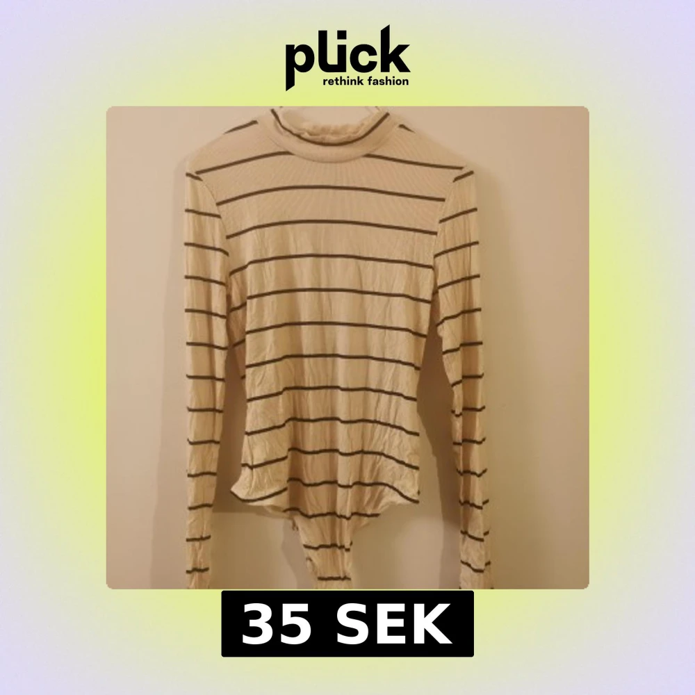Säljer en randig body med polo från H&M. Toppen är långärmad och har en ribbad struktur samt hög hals. Materialet är 95% LivaEco viskos, vilket gör den mjuk och skön mot huden. Oanvänd.