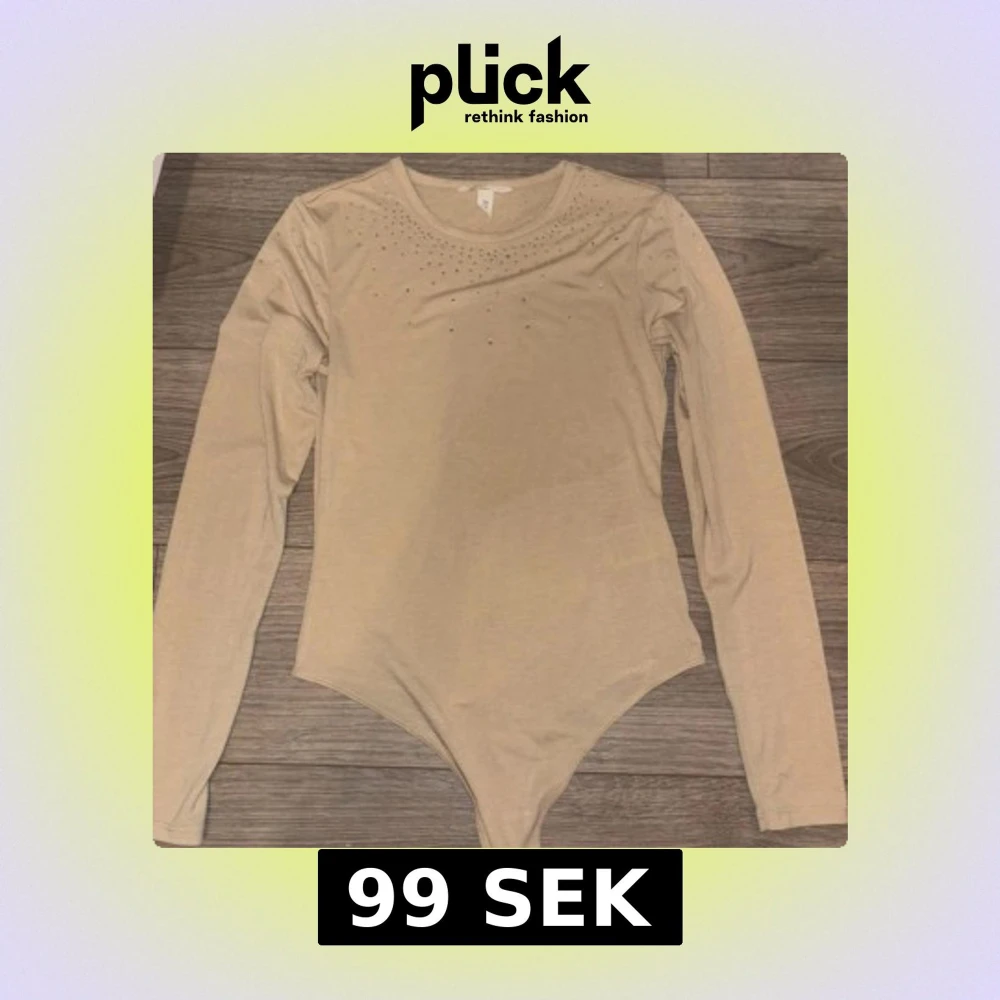 Snygg beige långärmad topp från H&M med rund halsringning och glittrande strassdetaljer över axlar och bröst. Mjuk och stretchig i bomullsmix, perfekt att styla med jeans eller kjol för en trendig look. Har aldrig används