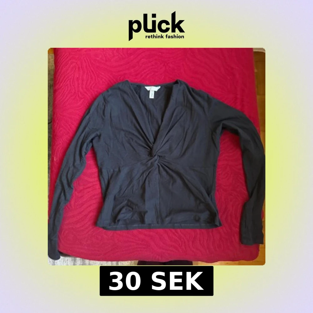 Svart långärmad topp från H&M med snygg omlottdesign och twistad detalj framtill. Djup v-ringning ger en trendig look. Tillverkad i mjuk bomull som känns skön mot huden. Perfekt att styla med jeans eller kjol för en cool vibe.