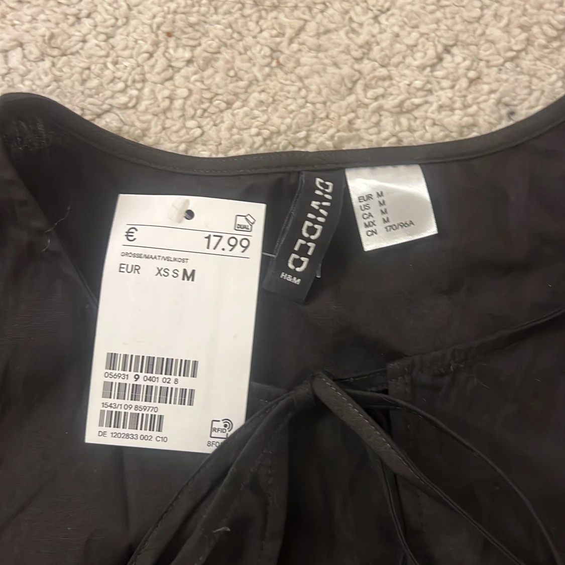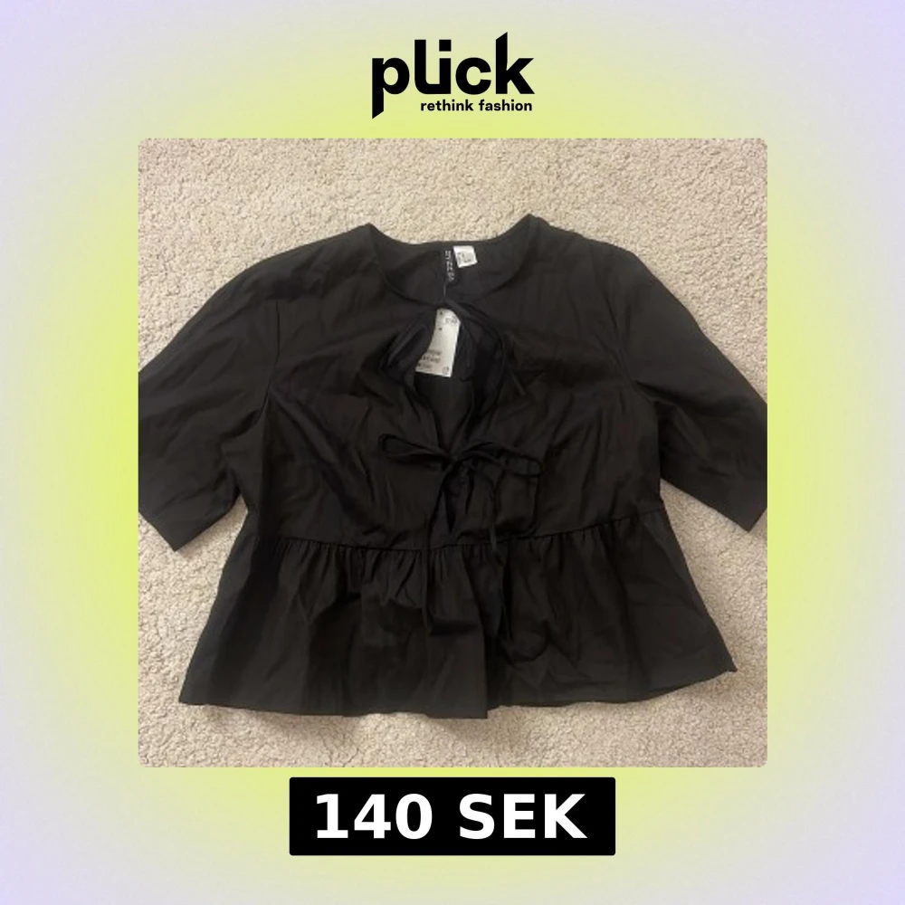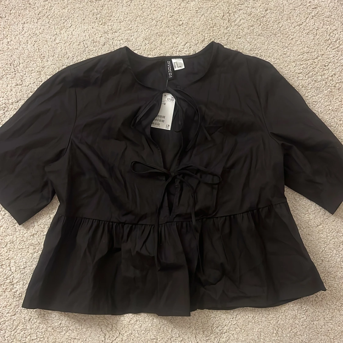 Svart blus från H&M med knytning framtill och lätt volang nertill. Modellen har korta ärmar och en rundad halsringning. Perfekt att styla med jeans eller kjol för en trendig look. Oanvänd med prislapp!