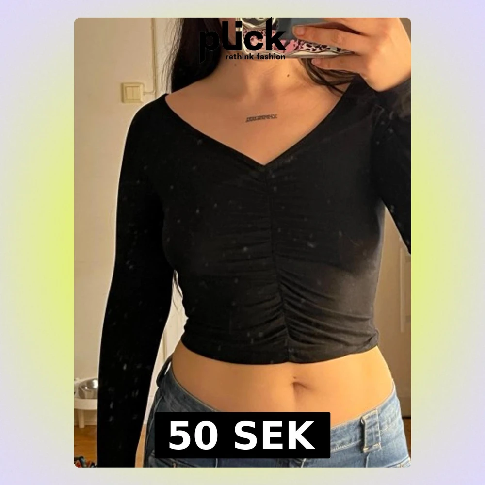 Snygg svart croppad topp med lång ärm och v-ringning. Toppen har rynkade detaljer framtill som ger en cool look och är perfekt att matcha med höga jeans. Materialet känns mjukt och stretchigt.