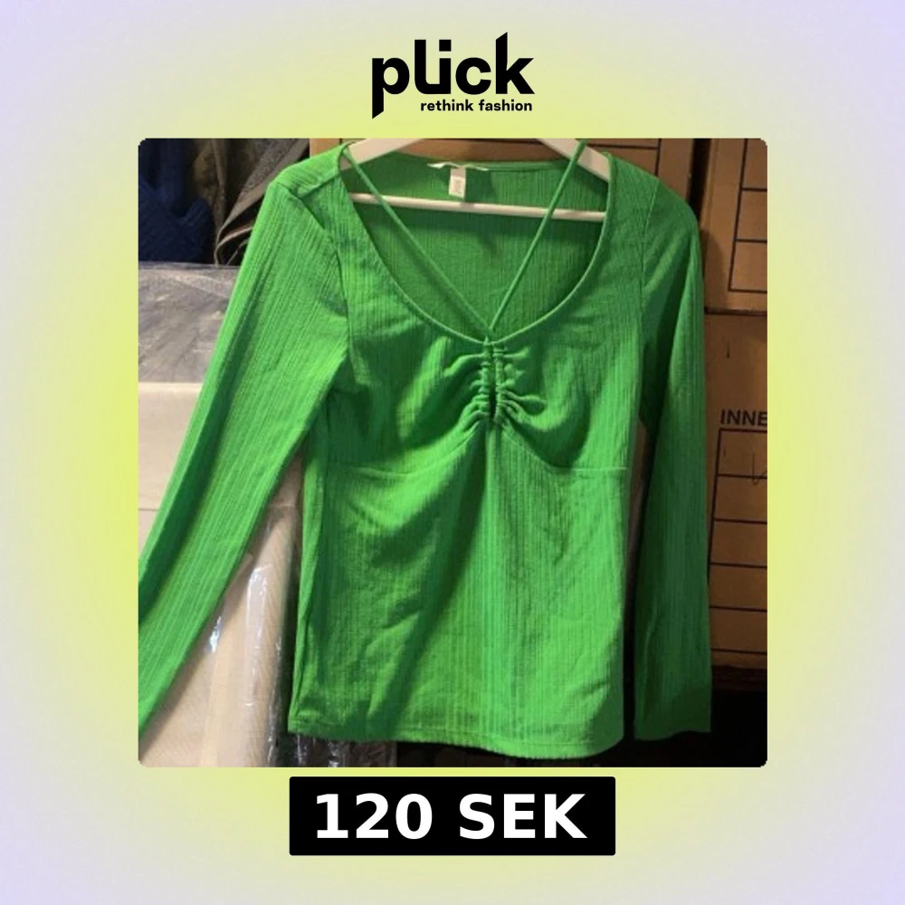 Säljer en grön långärmad topp med djup v-ringning och rynkdetalj framtill. Toppen har smala band som korsas i ryggen och är tillverkad i ett ribbat material. Perfekt för dig som vill sticka ut med färg!