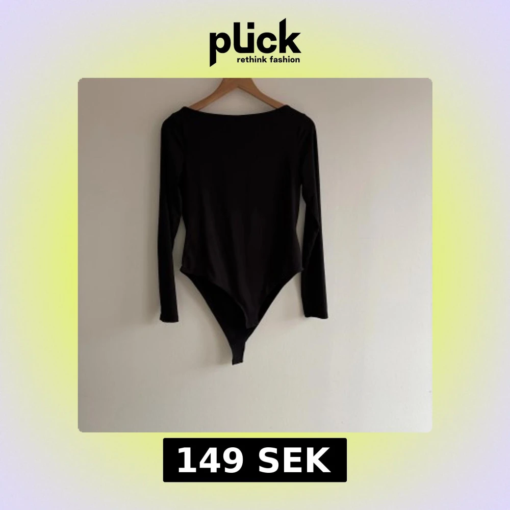 Svart långärmad bodysuit från H&M i storlek M. Modellen har en enkel, stilren design med rundad hals och smal passform. Materialet är mjukt och stretchigt, troligen polyester eller bomull. Perfekt att styla med jeans eller kjol för en clean look.