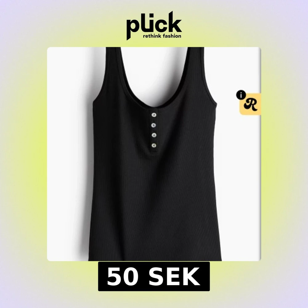 Svart ribbad linnetopp med djup rundad hals och fyra små knappar framtill. Perfekt för dig som gillar enkel och stilren design. Materialet är mjukt och stretchigt för en skön passform. Snygg att matcha med jeans eller shorts.
