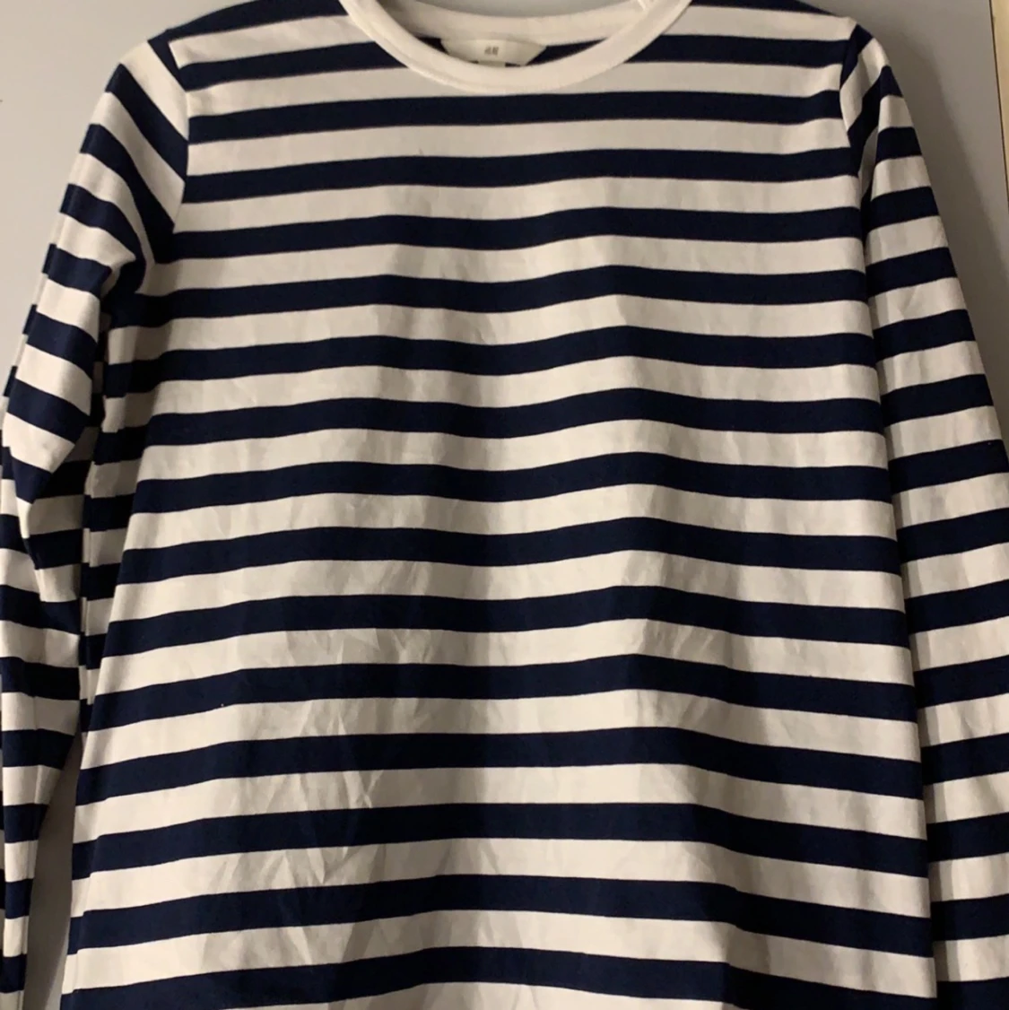 En vit o blå lång ärmad tröja från hm. Aldrig använd. Storlek S men passar även XS.