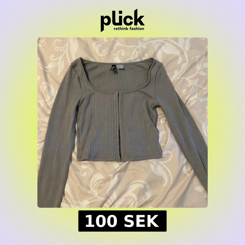 Snygg grå croppad topp med långa ärmar och ribbad struktur. Toppen har en djup, rundad urringning och stängs framtill med hyskor för en cool detalj. Perfekt att styla med jeans eller kjol för en trendig look. Priset går att diskutera