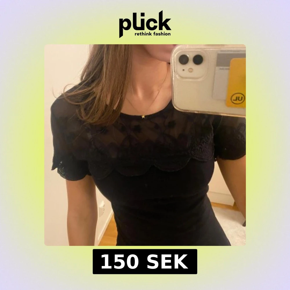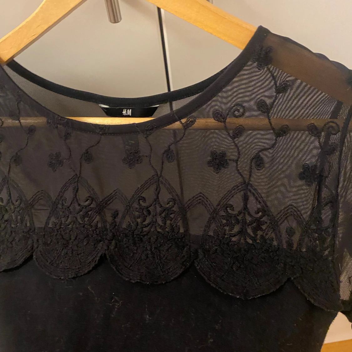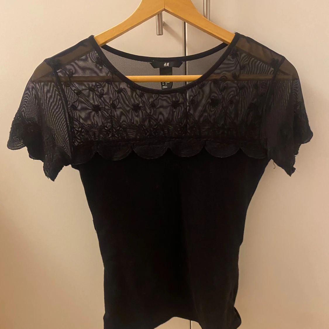 Supersnygg svart topp från H&M med transparent mesh upptill och broderade spetsdetaljer. Blusen har korta ärmar och rund halsringning.