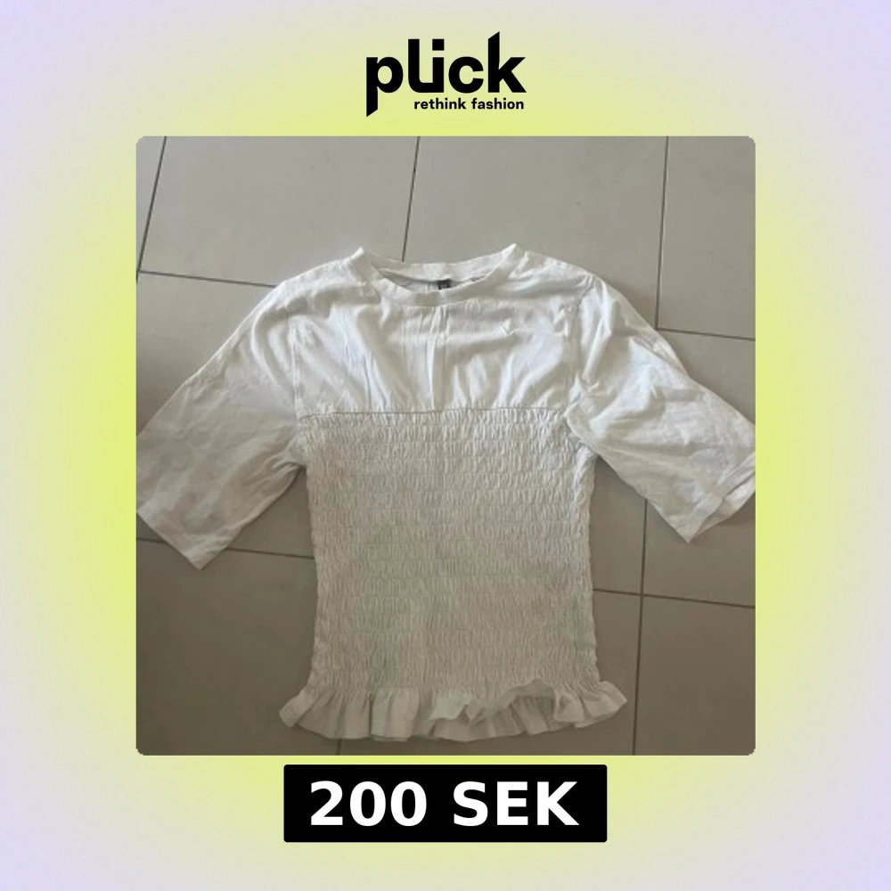 Säljer en söt vit blus från H&M med smockad midja och volangkant nertill.